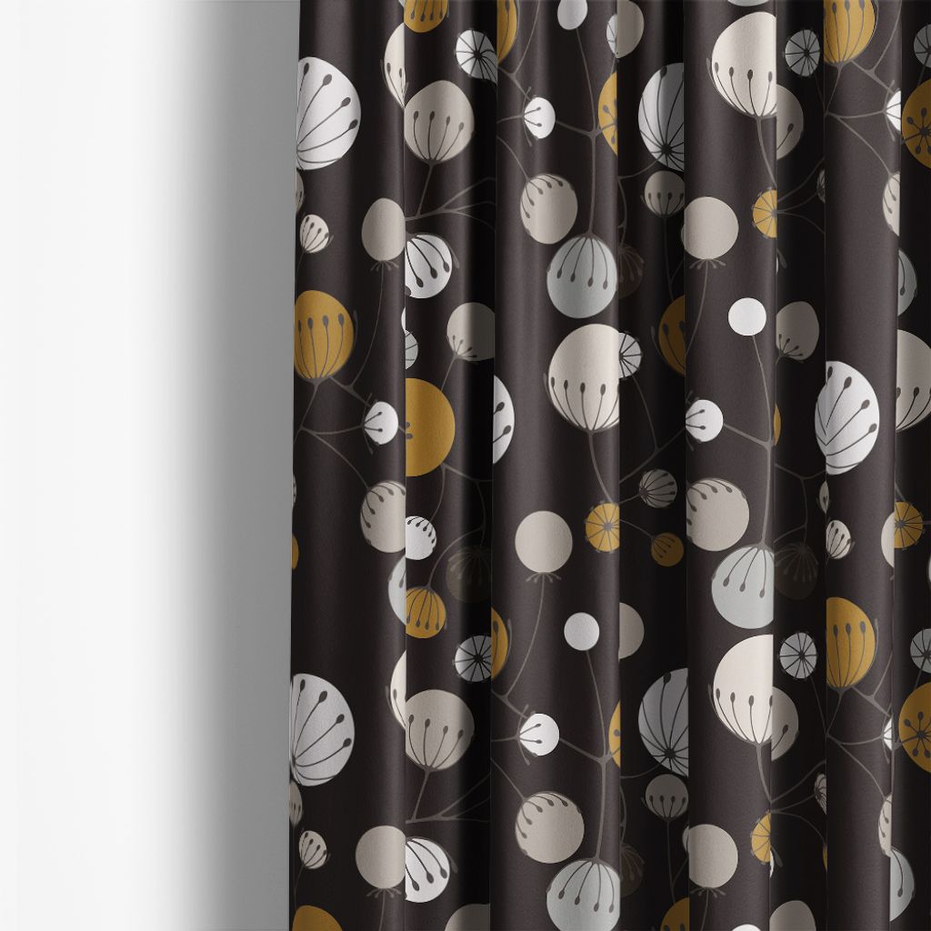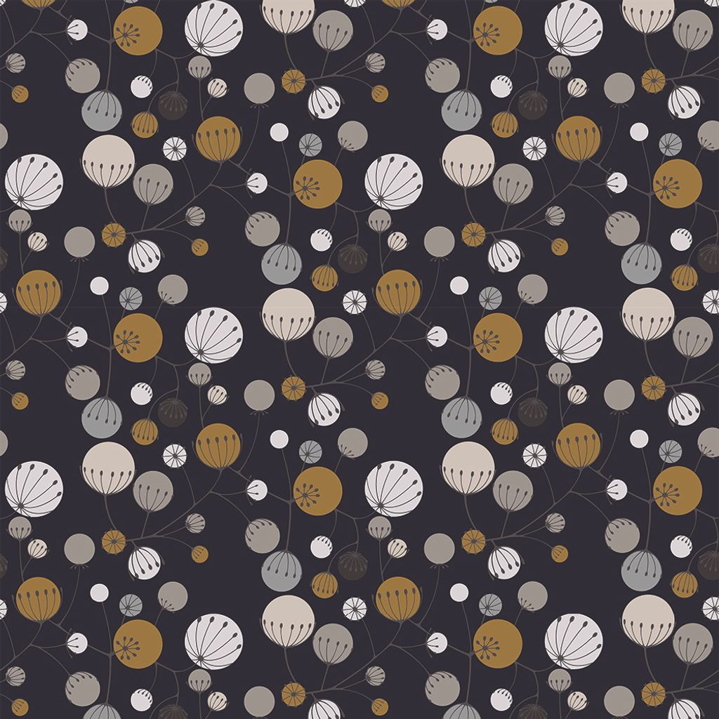 Frö svart tyg har ett sofistikerat och modernt mönster där stiliserade frökapslar sprider sig över en djup, mörk bakgrund.