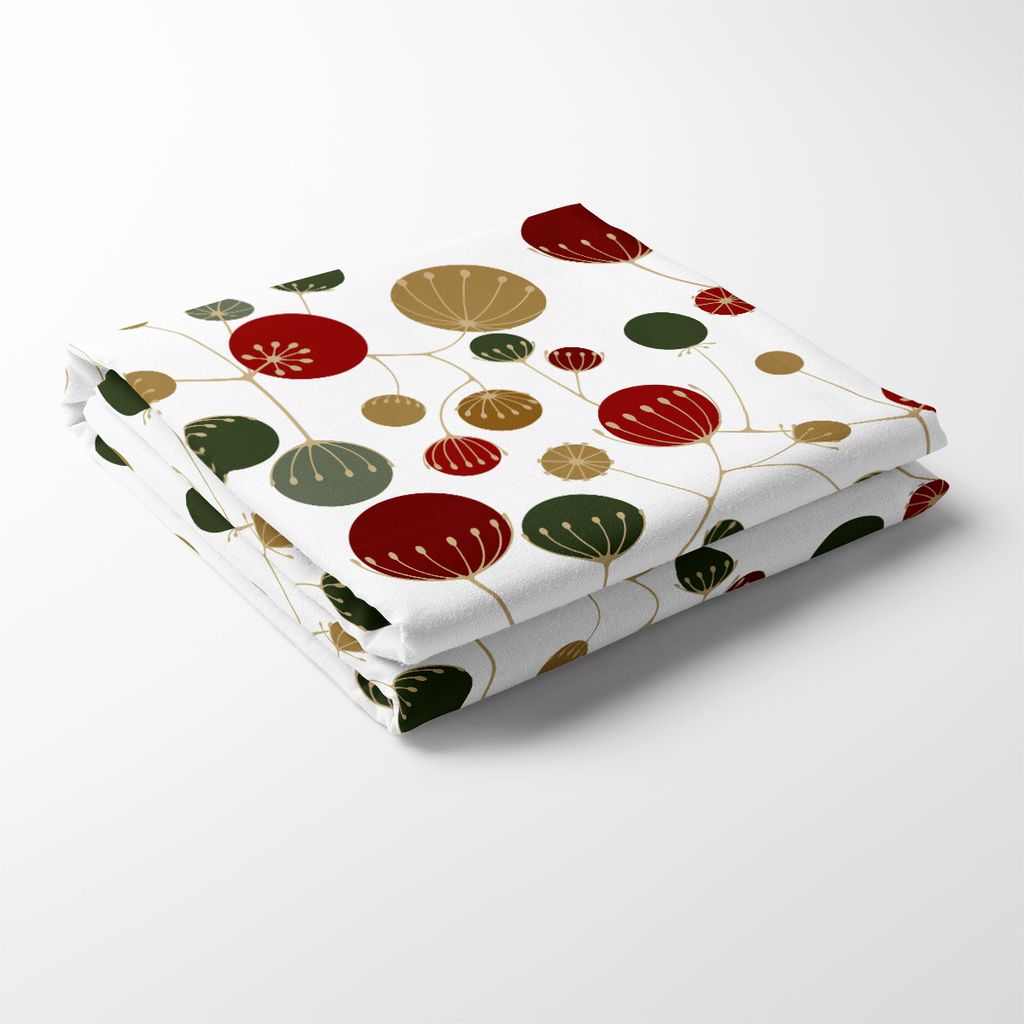 Bordsduk Frö vit-röd är en duk med inspiration från naturens små underverk. Frökapslar i nyanser av djuprött, olivgrönt och beige, sprider sig lekfullt över den ljusa