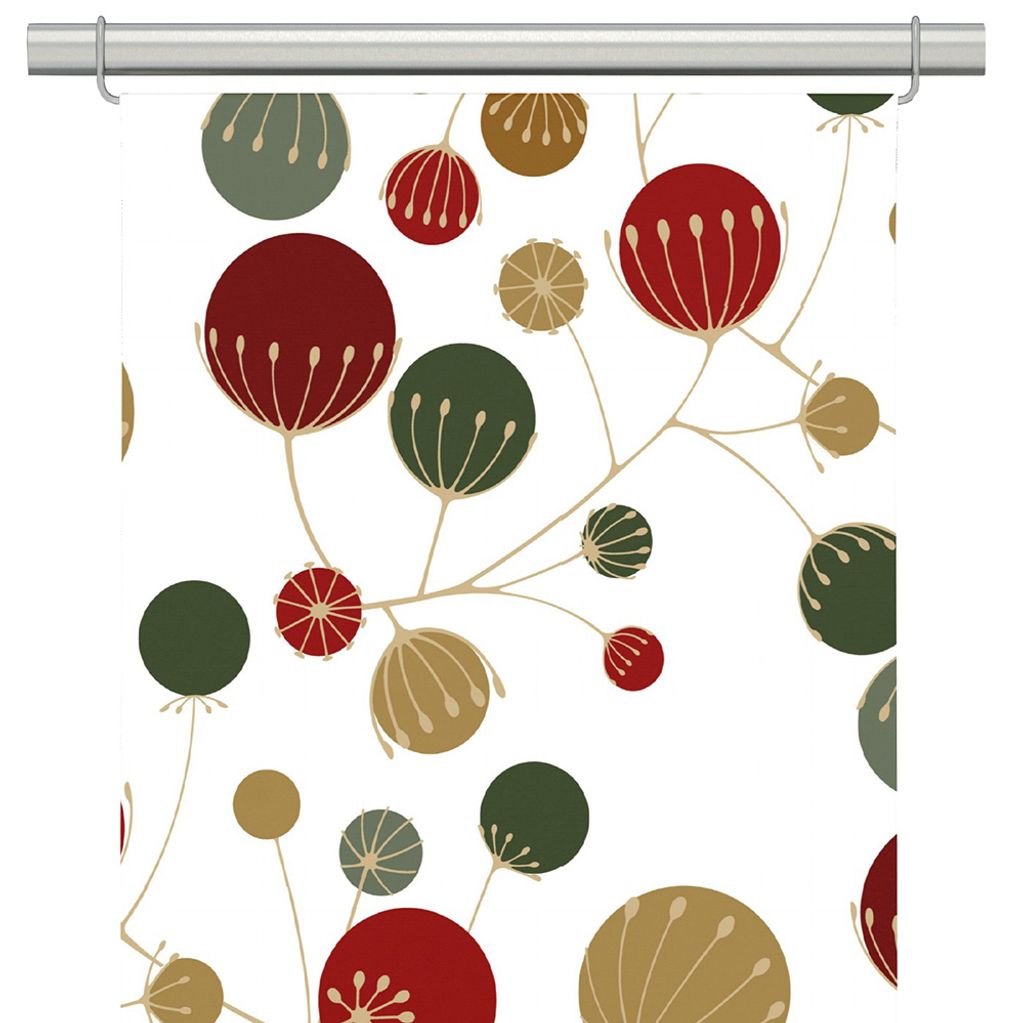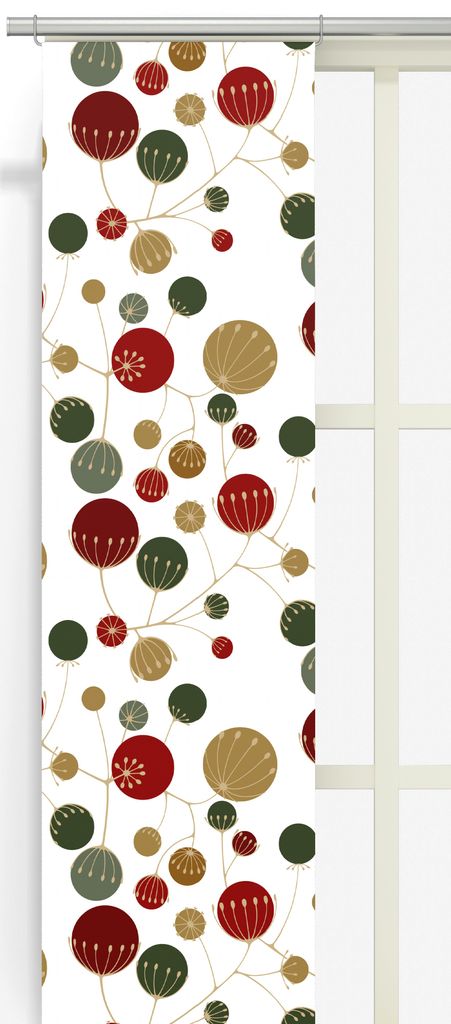 Frö vit-röd panelgardiner med ett stämningsfullt mönster av frökapslar i röda, vinröda, gröna och guldiga toner. Perfekta för en modern julkänsla eller som en färgglad detalj året runt.
