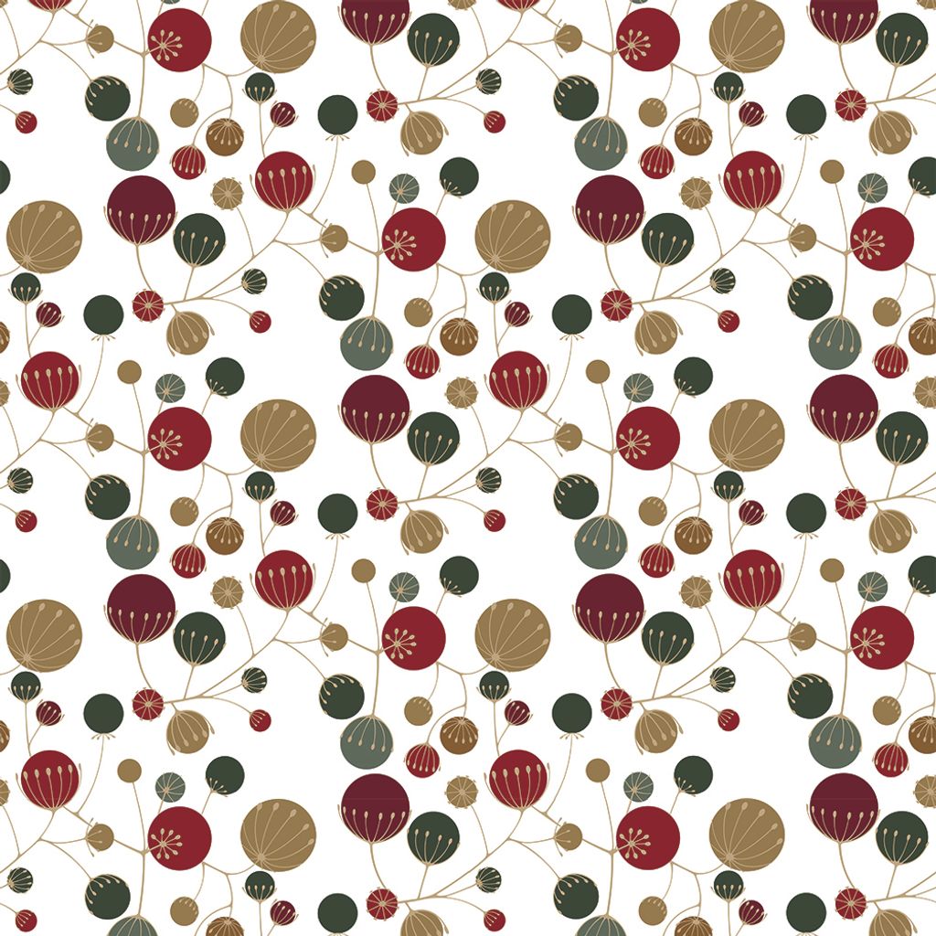 Frö vit-röd är ett charmigt och modernt mönster med inspiration från naturens små underverk. Frökapslar i nyanser av djuprött, olivgrönt och beige, sprider sig lekfullt över den ljusa bakgrunden och skapar ett livfullt men samtidigt harmoniskt intryck.