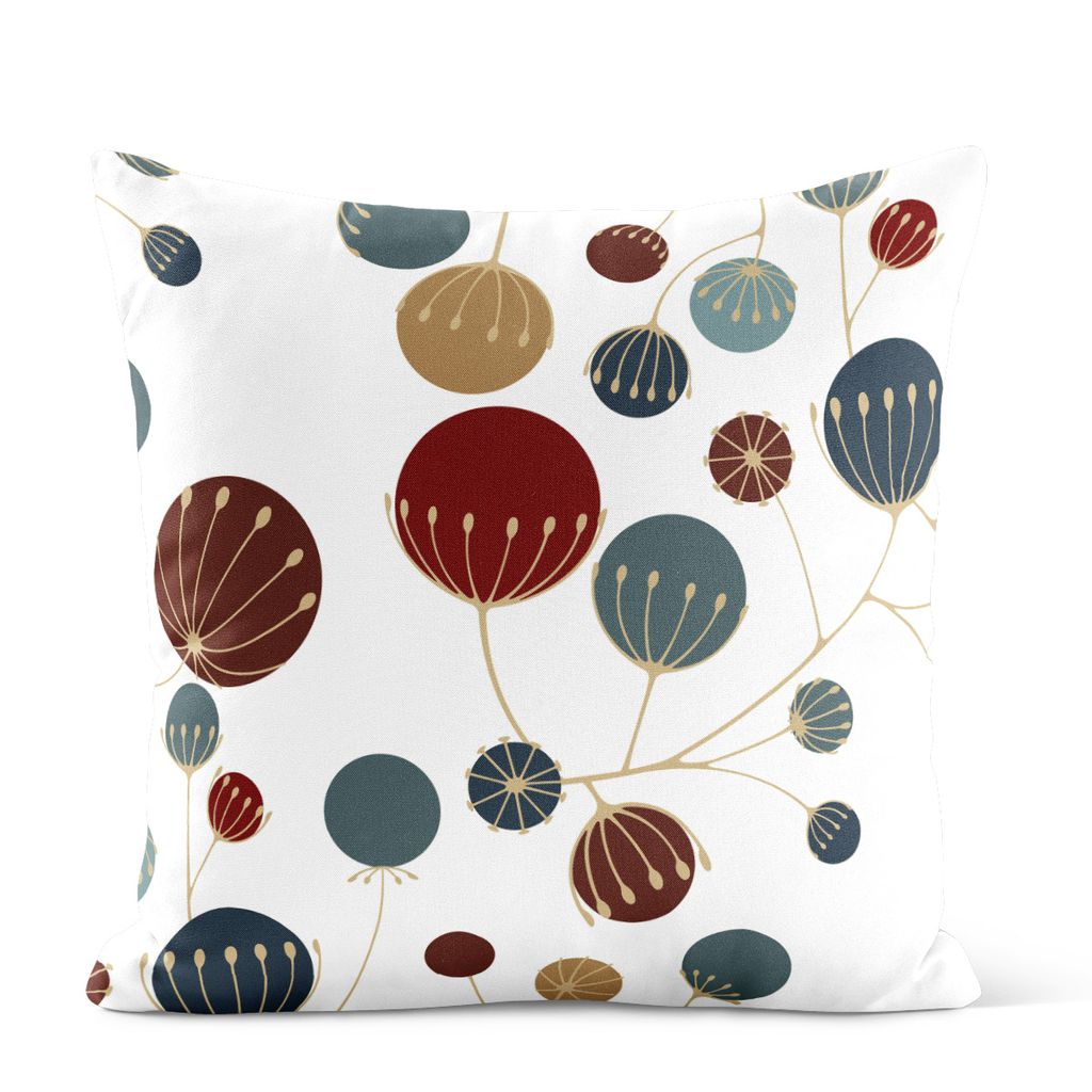 Vitt kuddfodral med livliga vinröda, blå och guldfärgade frökapslar i ett mjukt, modernt mönster. Perfekt för att tillföra en skandinavisk touch i hemmet.