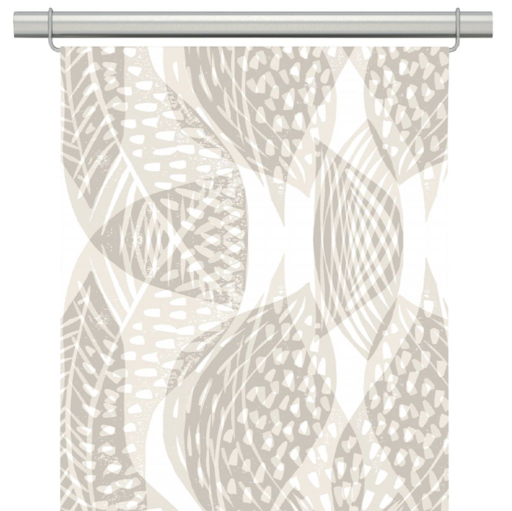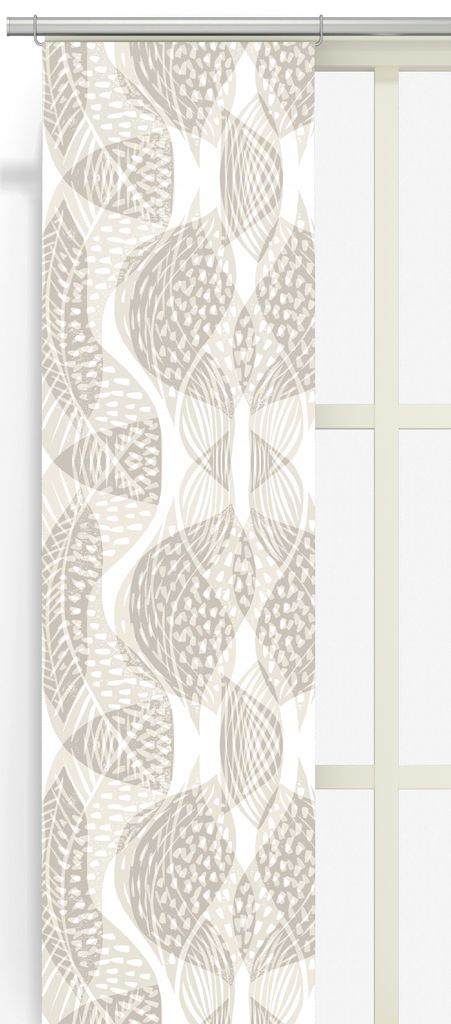 Froda panelgardin i beige halvlinne har ett grafiskt bladmotiv i mjuka naturtoner – ett harmoniskt val för dig som vill inreda med lugn och modern karaktär. Ofållad nederkant med overlocksöm.