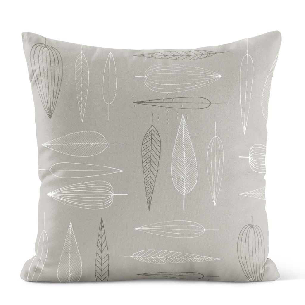 Kuddfodral i beige bomull med vita och grå blad. Design av Ulla Gustavsson – stilrent och harmoniskt från Arvidssons Textil.