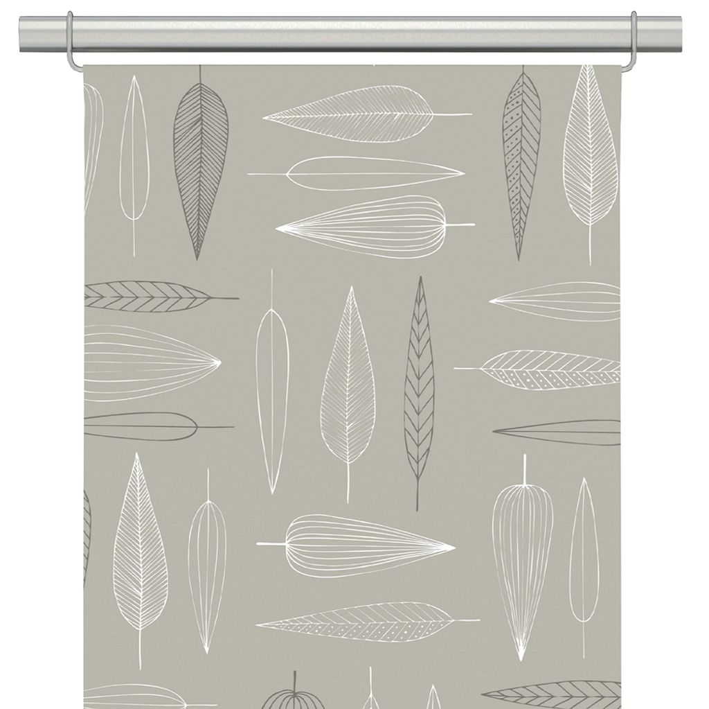 2-pack panelgardiner med retroinspirerat bladmönster i dämpade beige toner. Baksidan på gardinen är vit.