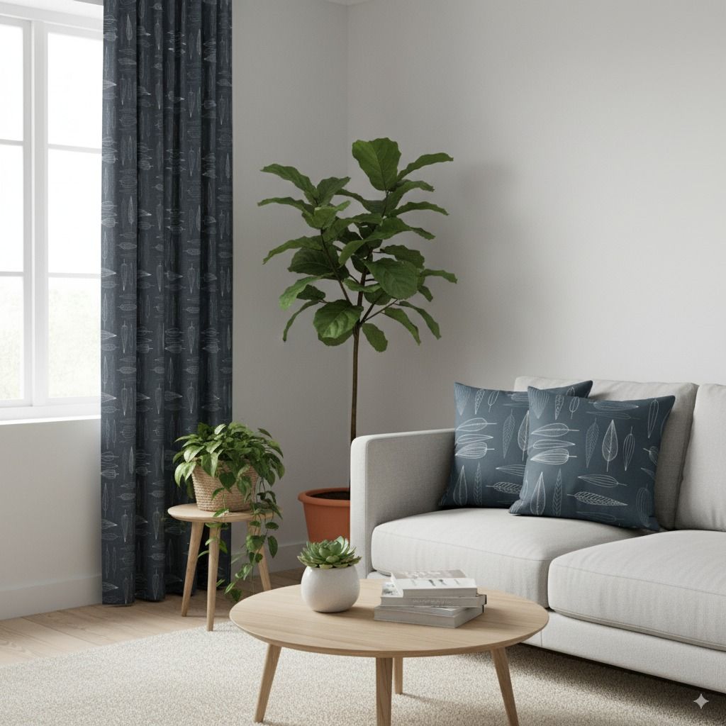 Eleganta gardiner med stilrent bladmotiv i blått. Frostblad blå förmedlar en känsla av lugn, modern design och naturlig harmoni – perfekt för ett stilrent hem med skandinavisk känsla.
