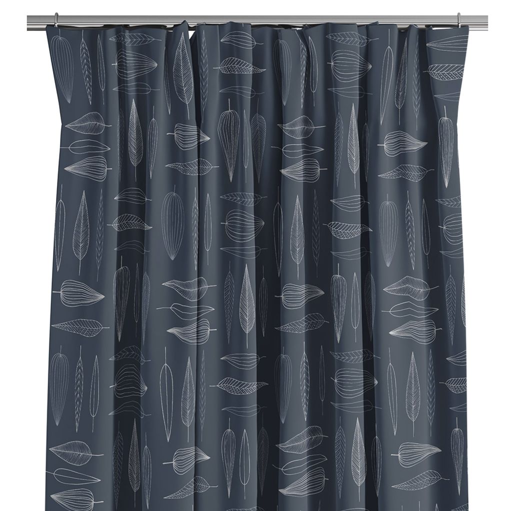 Frostblad blå är ett sofistikerat gardiner där form och funktion möts i en perfekt balans. Tyget är designat med ett diskret och harmoniskt mönster av stiliserade blad i olika former och nyanser, tryckta i vitt och grått mot en djupblå bakgrund. Det skapar en vacker kontrast som ger rummet både karaktär och ett rogivande uttryck.