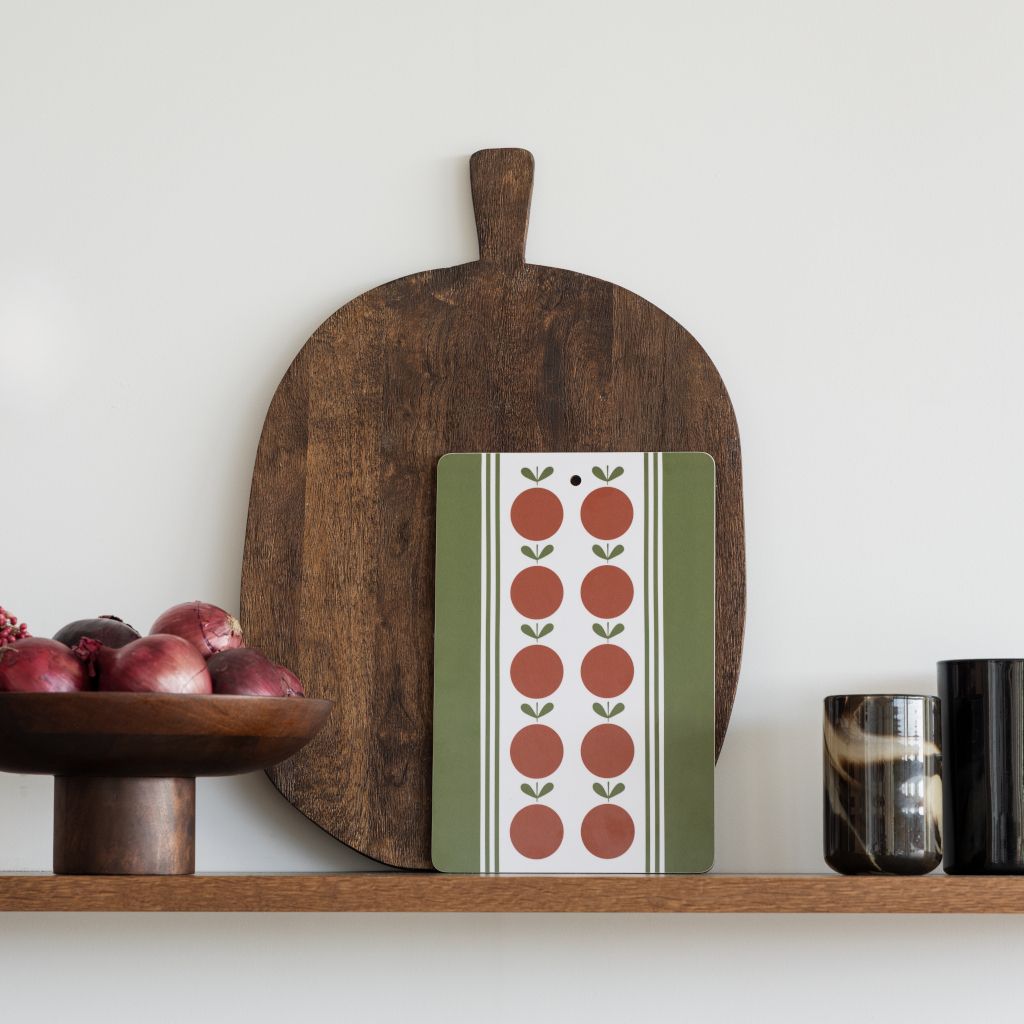 Låt julens smaker presenteras med stil! Frukt och kaka, uppläggningsbräda i rödgrönt från Almedahls kombinerar nostalgi och funktion i ett. Den dekorativa brädan pryds av det älskade mönstret Frukt och kaka, där röda äpplen och stiliserade småkakor möts i en lekfull komposition. Det grafiska formspråket flirtar med 60-talets design och skapar en hemtrevlig känsla – perfekt till julens dukning eller som en fin detalj på köksbänken året om.