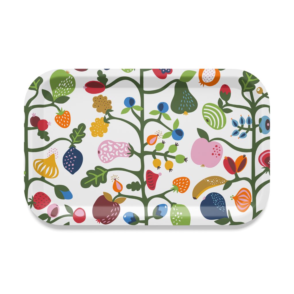 Stilren bricka med färgstarkt fruktmotiv, tillverkad i Sverige. Perfekt för servering eller dekoration.