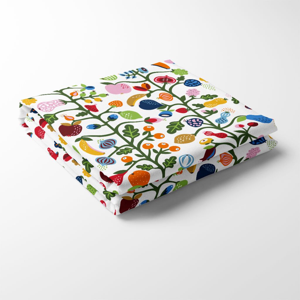 Färgglad bordsduk med frukt och bär i ett livfullt mönster. Perfekt för att skapa en inbjudande och lekfull atmosfär i köket eller matsalen. Duken finns i 4 olika storlekar.