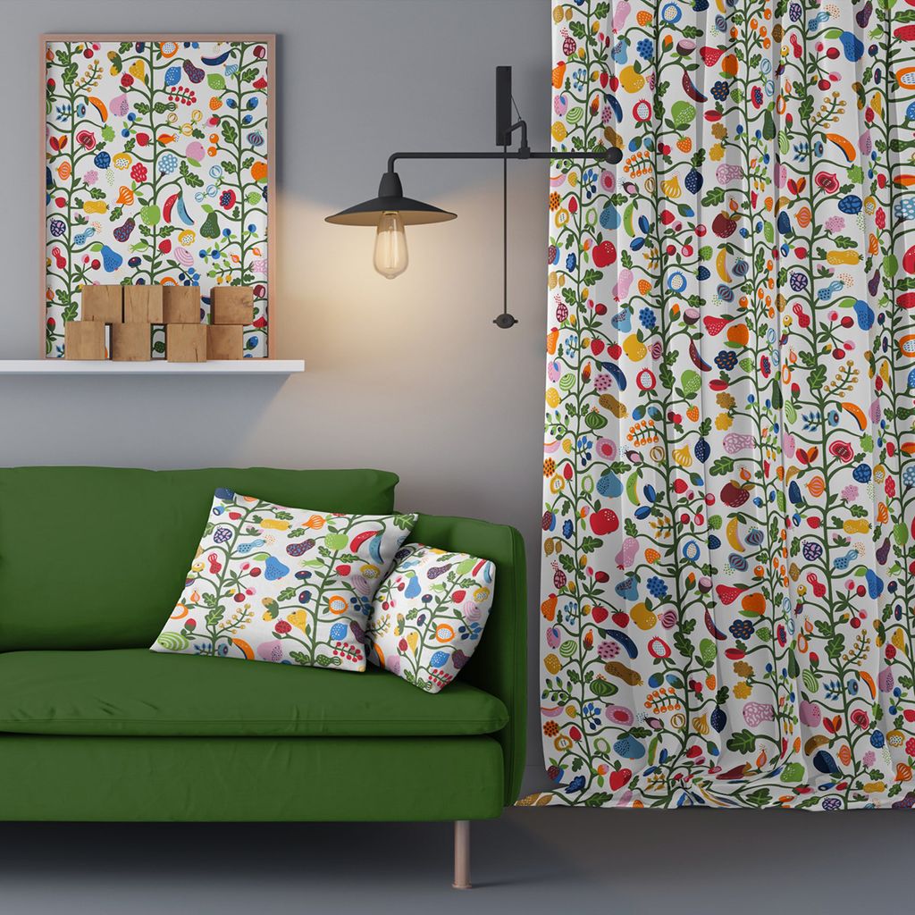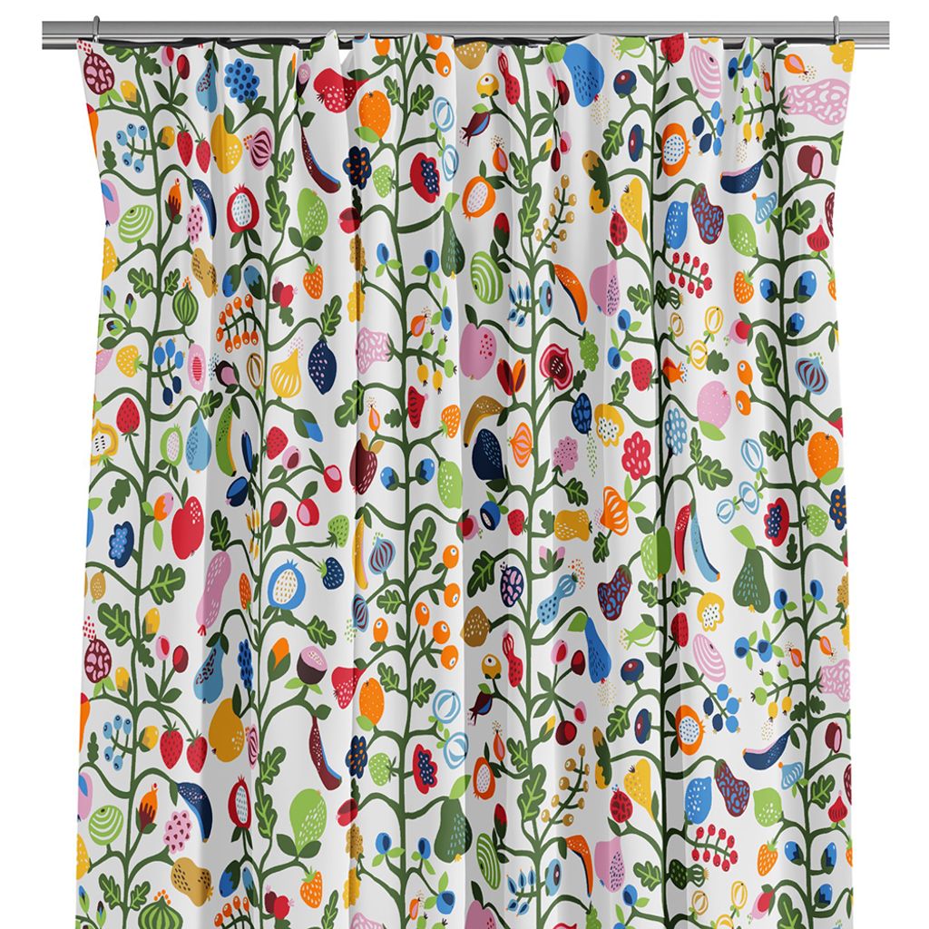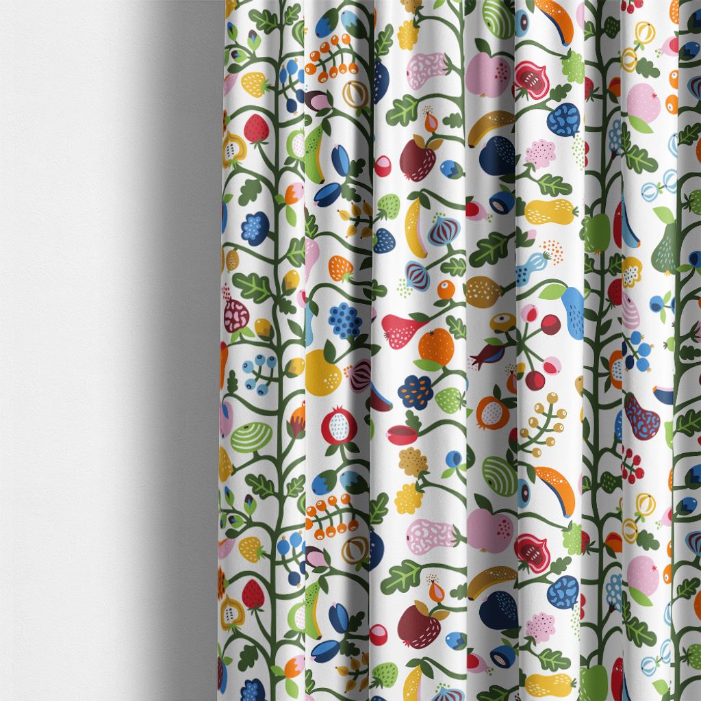 Fruktträd multi gardiner har ett färgstarka mönster med frukter och bär som klättrar längs gröna grenar. Perfekt för att skapa en lekfull och energifylld atmosfär.