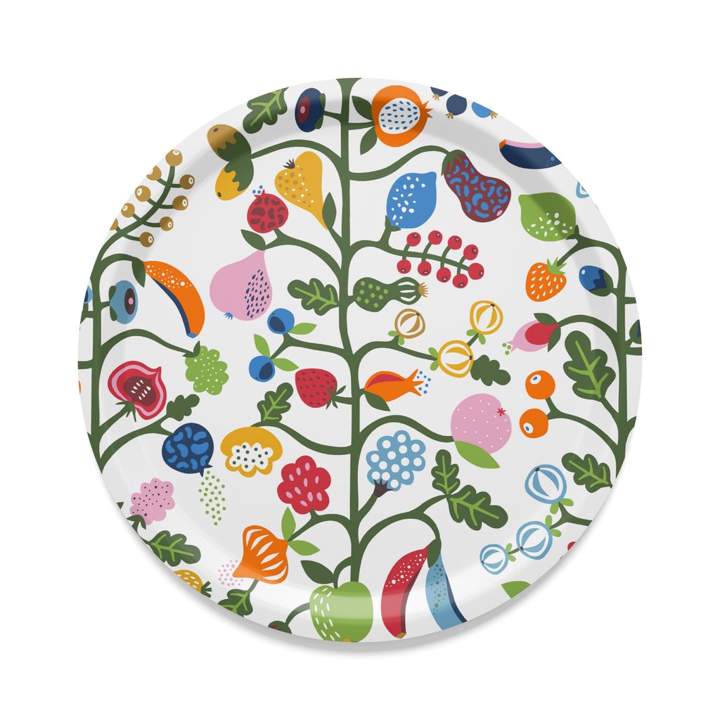 Fruktträd Multi är en rund bricka med ett vackert och färgstarkt mönster av frukter och blad, inspirerat av den svenska trädgården. Den är både praktisk och dekorativ och passar utmärkt för servering, fika eller som en stilfull inredningsdetalj.