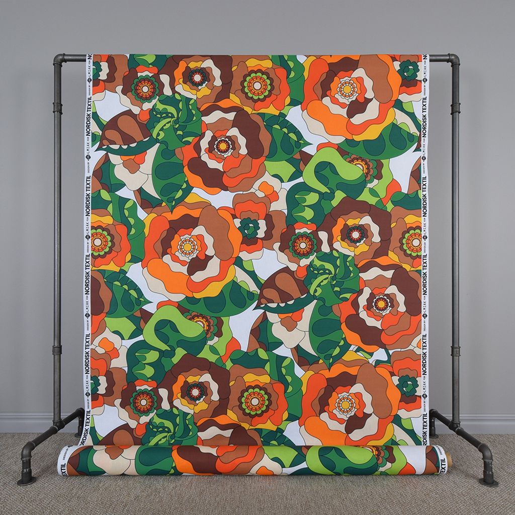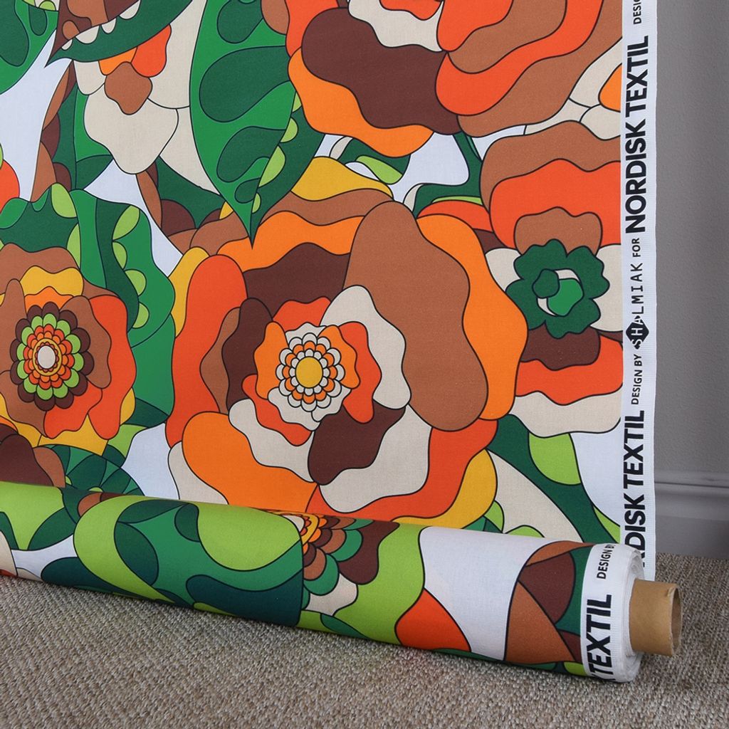 Vi har tillsammans med Shalmiak tagit fram och tryckt detta underbara tyger som verkligen har retro känsla med dom stora blommorna och färgsättningen.