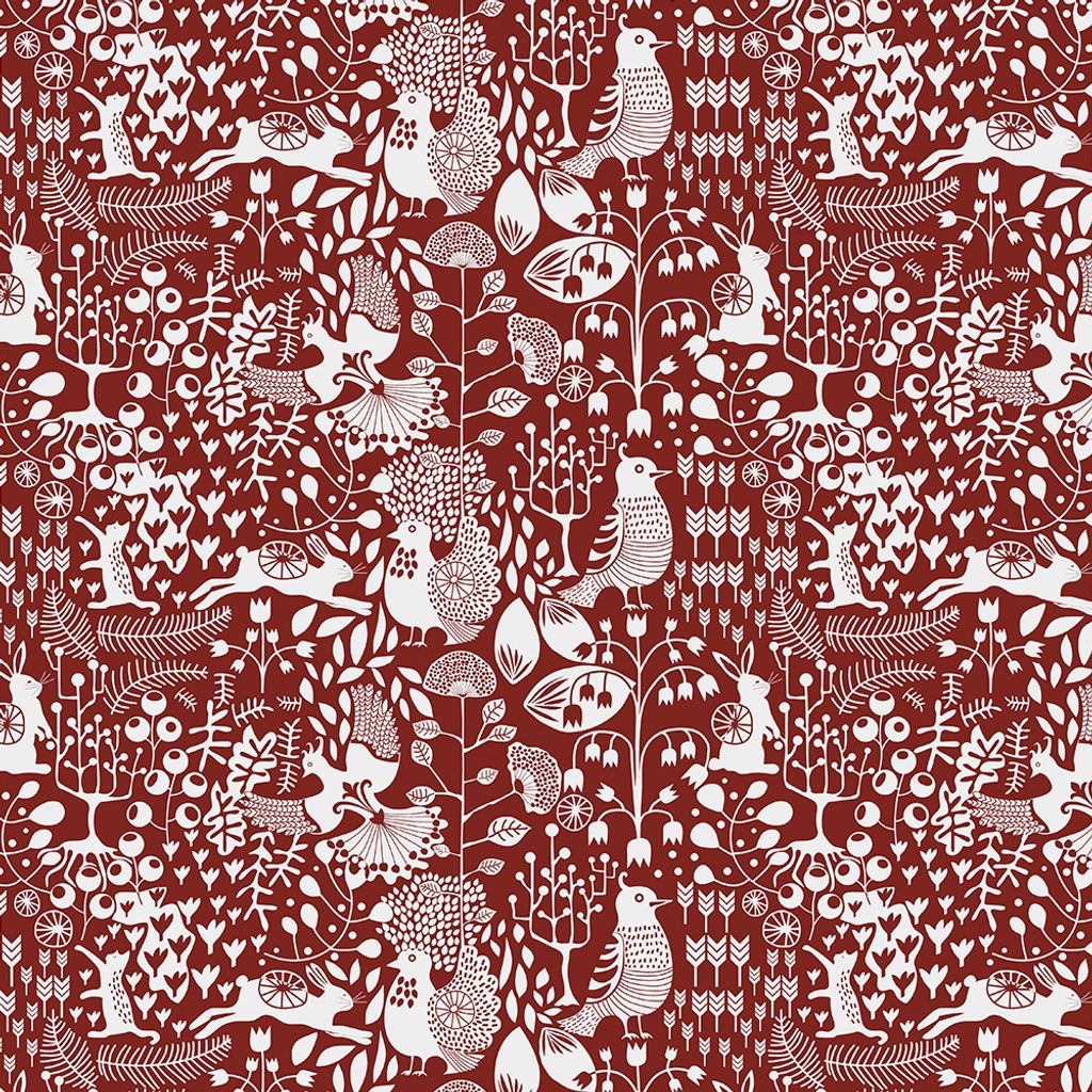 Bordsduk Fyri röd med sina vita illustrationer av skogsdjur, fåglar och växtlighet mot en djupt varmt röd bakgrund skapar mönstret en stark kontrast som är både dramatisk och elegant.