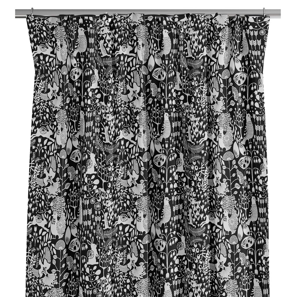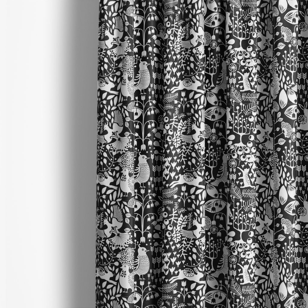 Fyri svart gardiner med vita illustrationer av skogsdjur, fåglar och växtlighet mot en djupt svart bakgrund skapar mönstret en stark kontrast som är både dramatisk och elegant. Levereras ouppfållad med overlock nedtill.