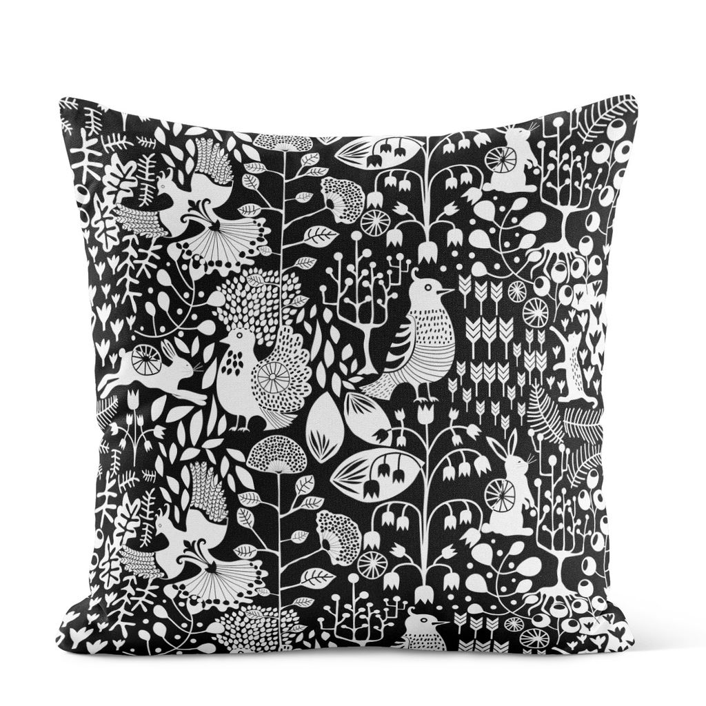 Elegant kuddfodral i svart och vitt med ett lekfullt naturmotiv. Perfekt för att skapa en stilfull, skandinavisk kontrast i din inredning.