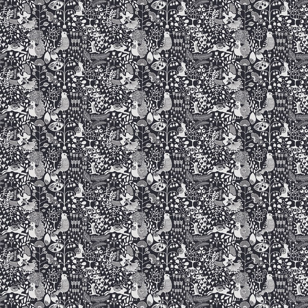 Fyri svart har ett intrikat mönster som väcker en känsla av magisk skog och sagornas värld. Med sina vita illustrationer av skogsdjur, fåglar och växtlighet mot en djupt svart bakgrund skapar mönstret en stark kontrast som är både dramatisk och elegant.