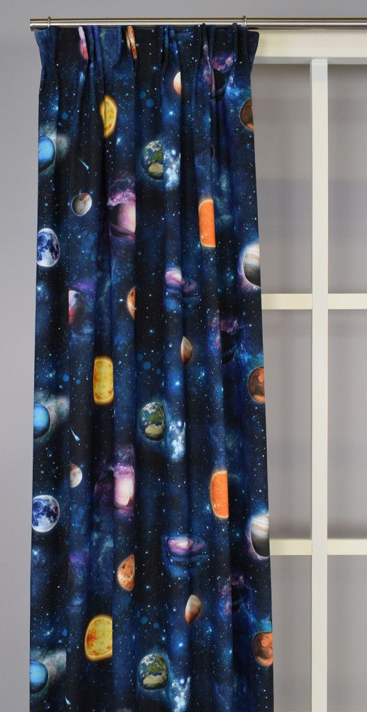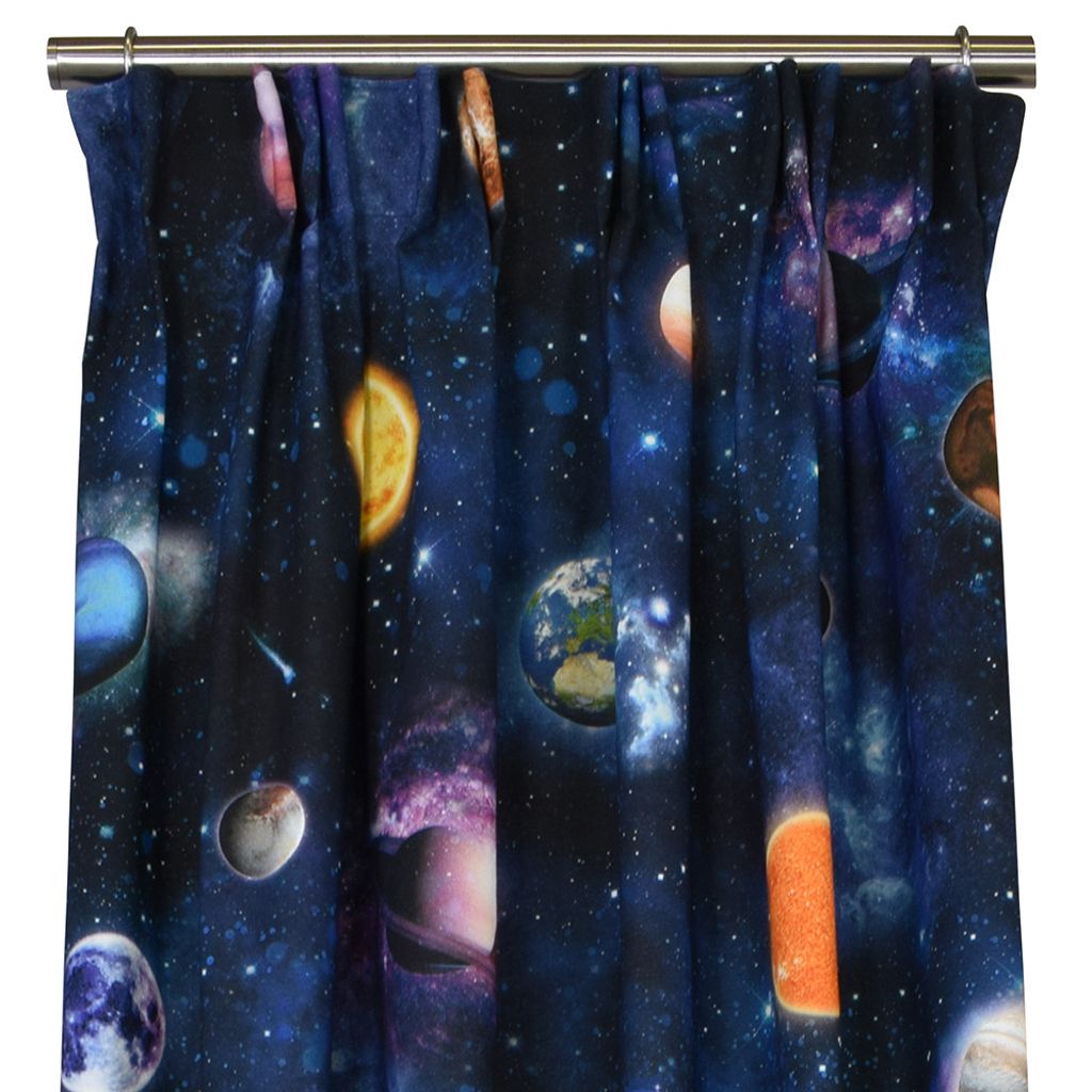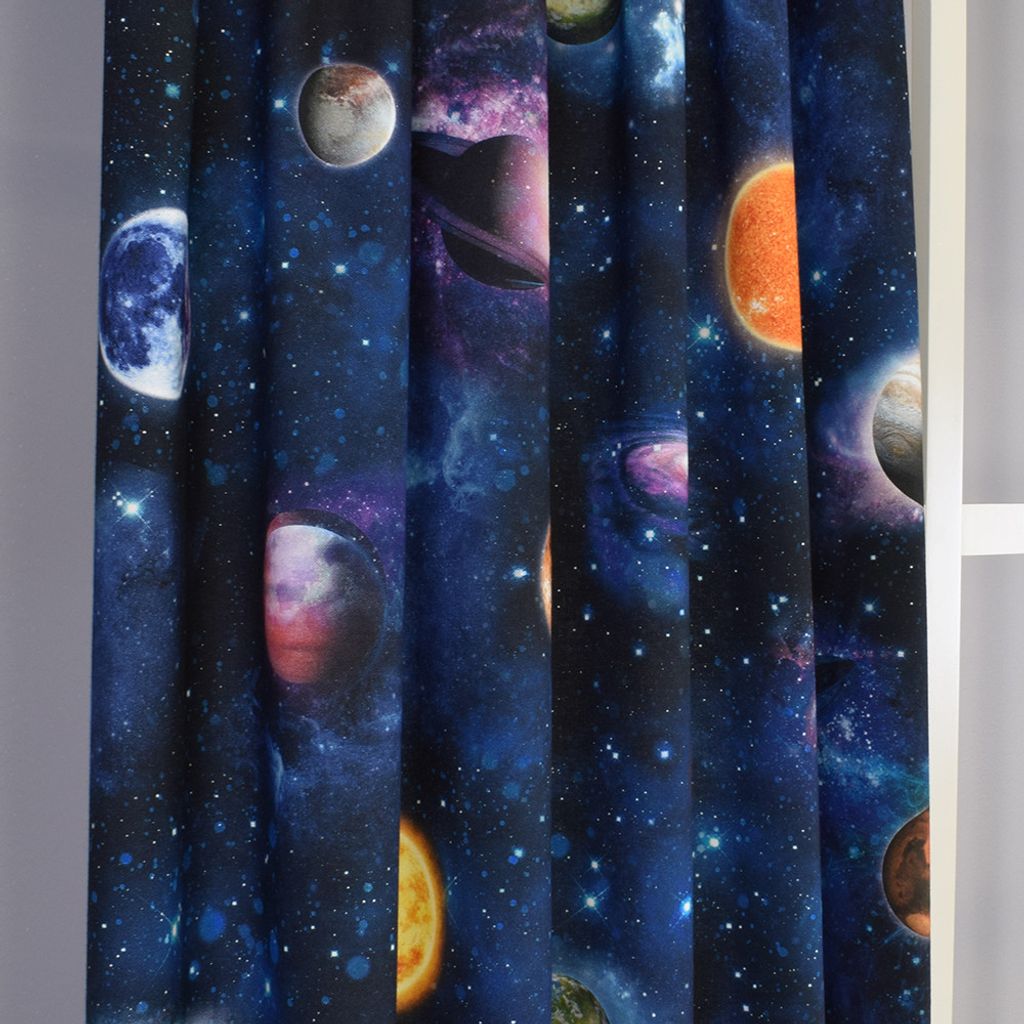 Gardinerna har ett livfullt motiv av planeter, stjärnor och galaxer som ger en känsla av att sväva i rymden.