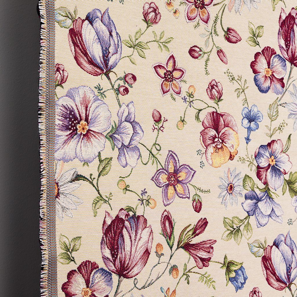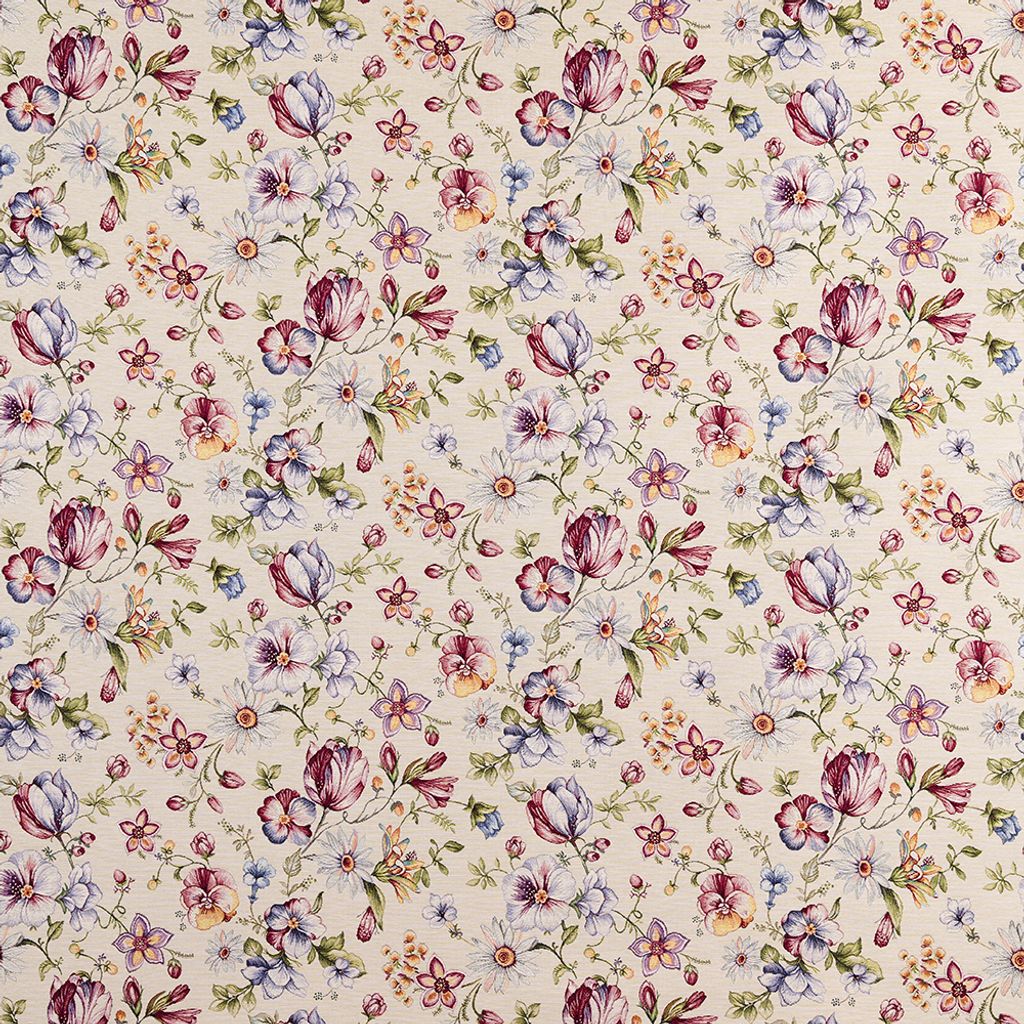 Ganita gobeläng är ett elegant och tidlöst möbeltyg med ett ljuvligt blomsterprint inspirerat av sommarängar. Mönstret består av stora och små blommor i harmoniska nyanser av vinrött, blått, rosa och grönt på en ljus botten, vilket skapar ett mjukt och romantiskt uttryck.