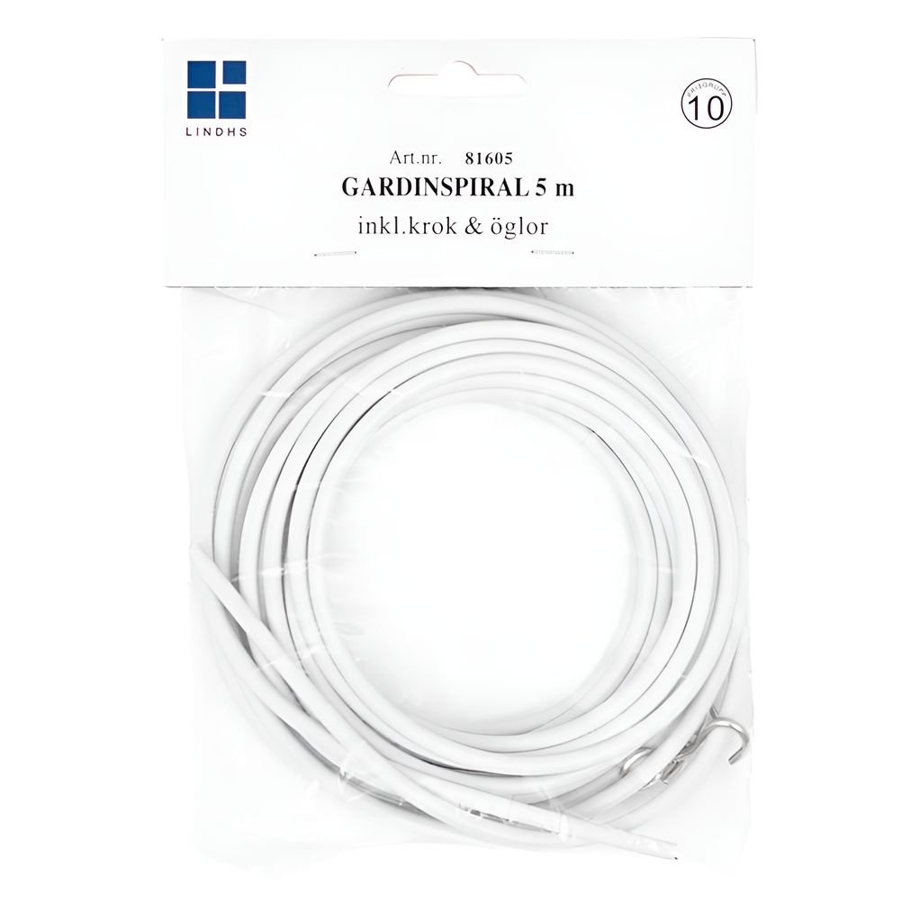 Klassisk spiralvajer med vit plastbeläggning.En gardinspiral är en perfekt lösning när du vill hänga upp en gardin eller andra textilier i ett litet fönster eller mindre utrymme. Gardinspiralen klipps av till önskad längd och monteras därefter enkelt med de medföljande krokarna och öglorna.