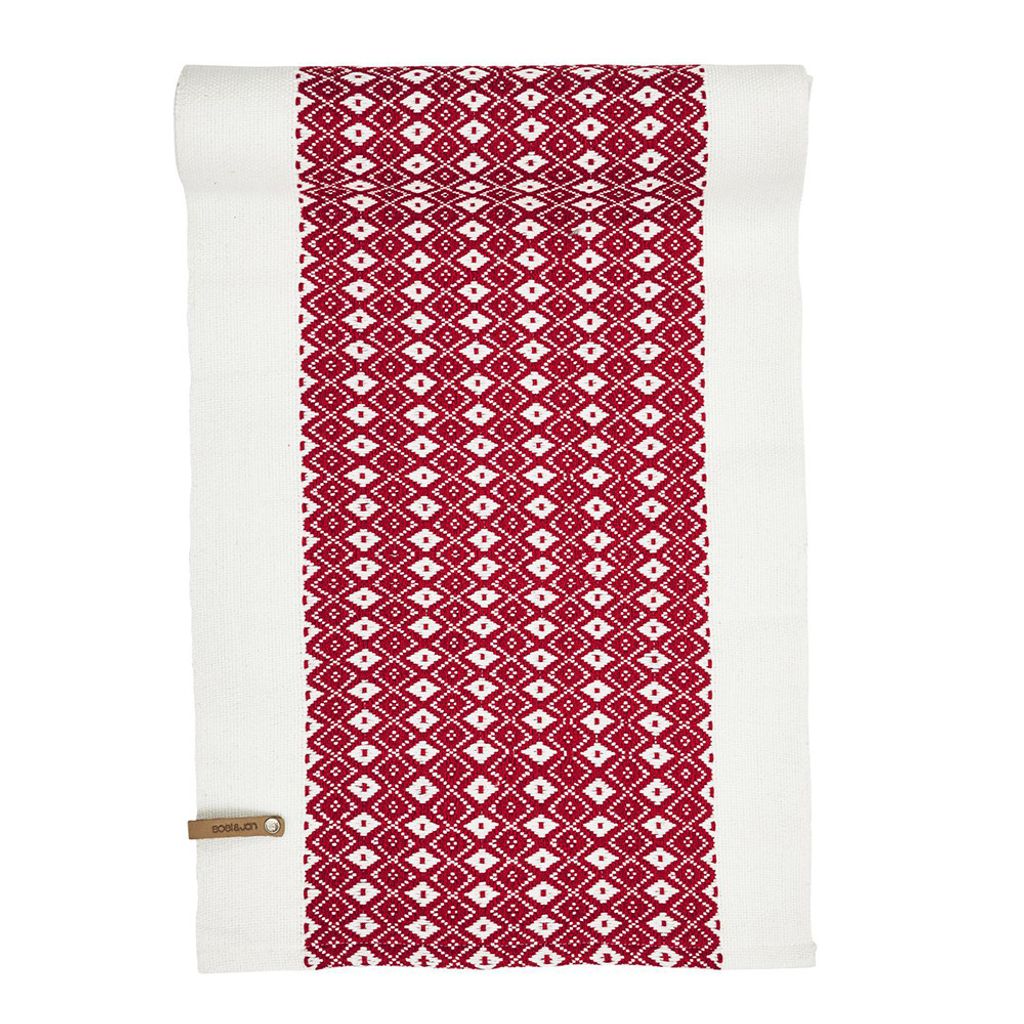 En ripslöpare i vitt och rött, löparen är vävd så att motsatt färg är på baksidan.