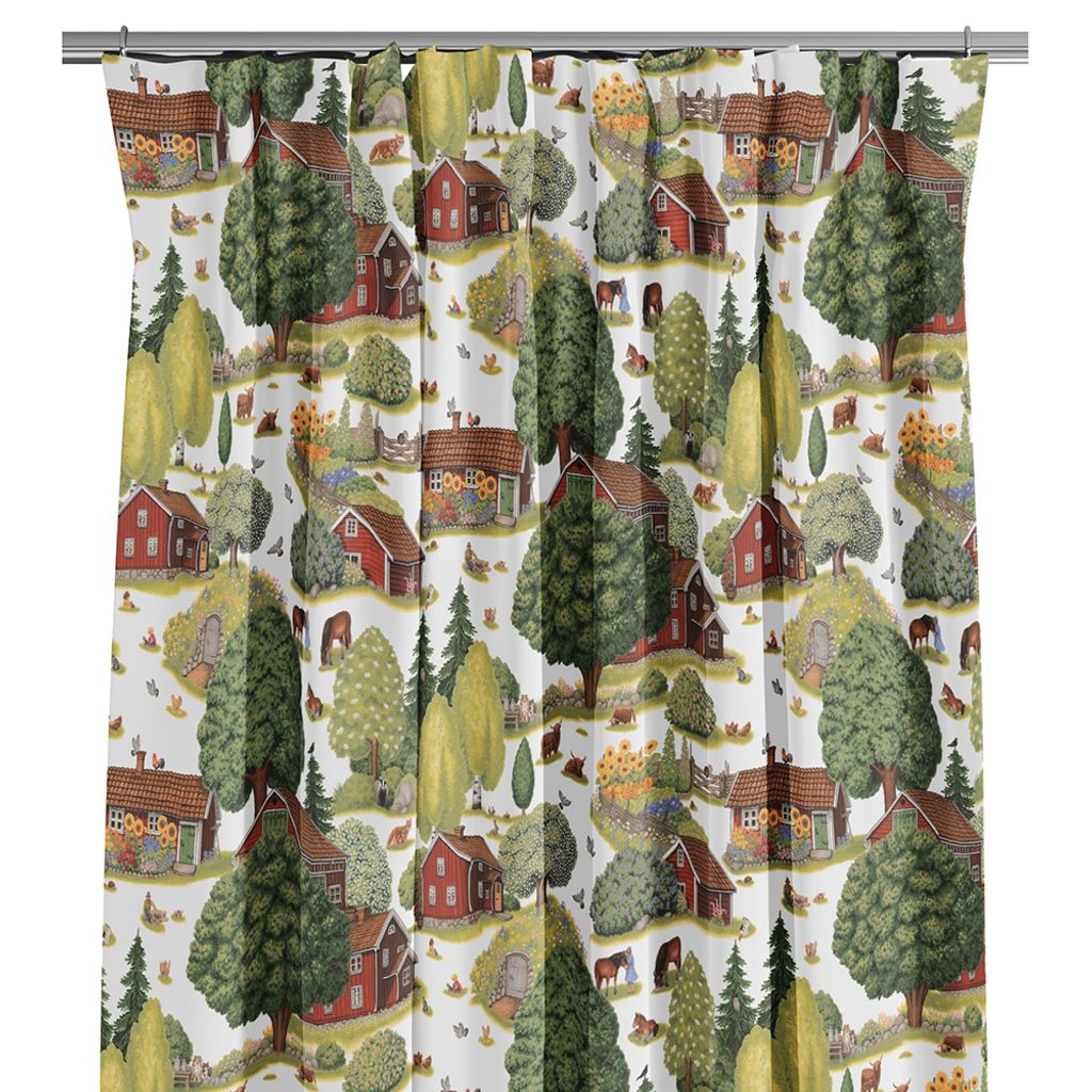 Skapa en varm och hemtrevlig atmosfär med Ginkalunda grön-röd gardiner. Det vackra mönstret fångar den svenska landsbygdens idyll med klassiska röda stugor, frodiga träd, färgglada blomsterrabatter och betande djur. De mjuka nyanserna av grönt och rött ger ett harmoniskt intryck som passar både i traditionella och moderna inredningsstilar.
