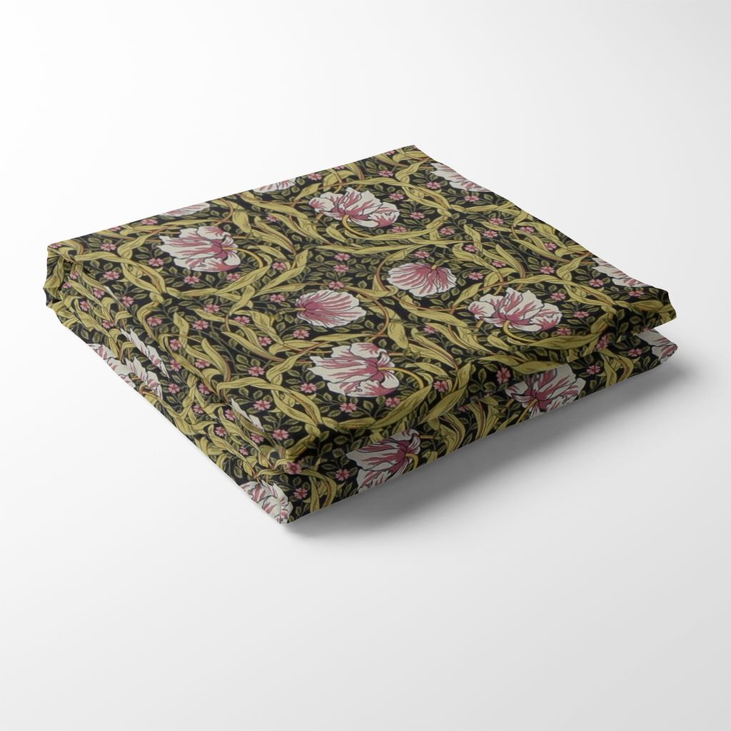 Bordsduk med Morris inspirerat mönster med stora och små rosa blommor och snirkligt grönt mönster på mörkgrön botten.
