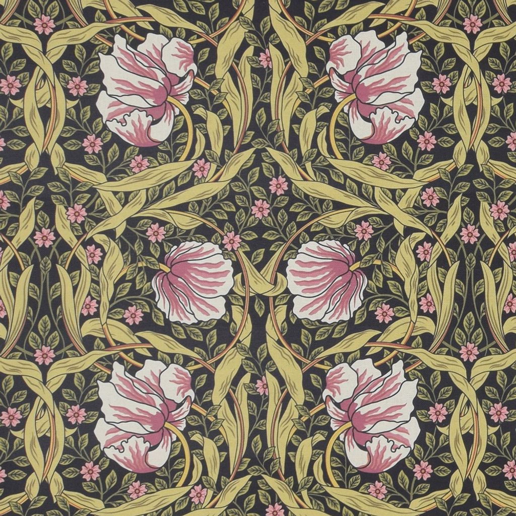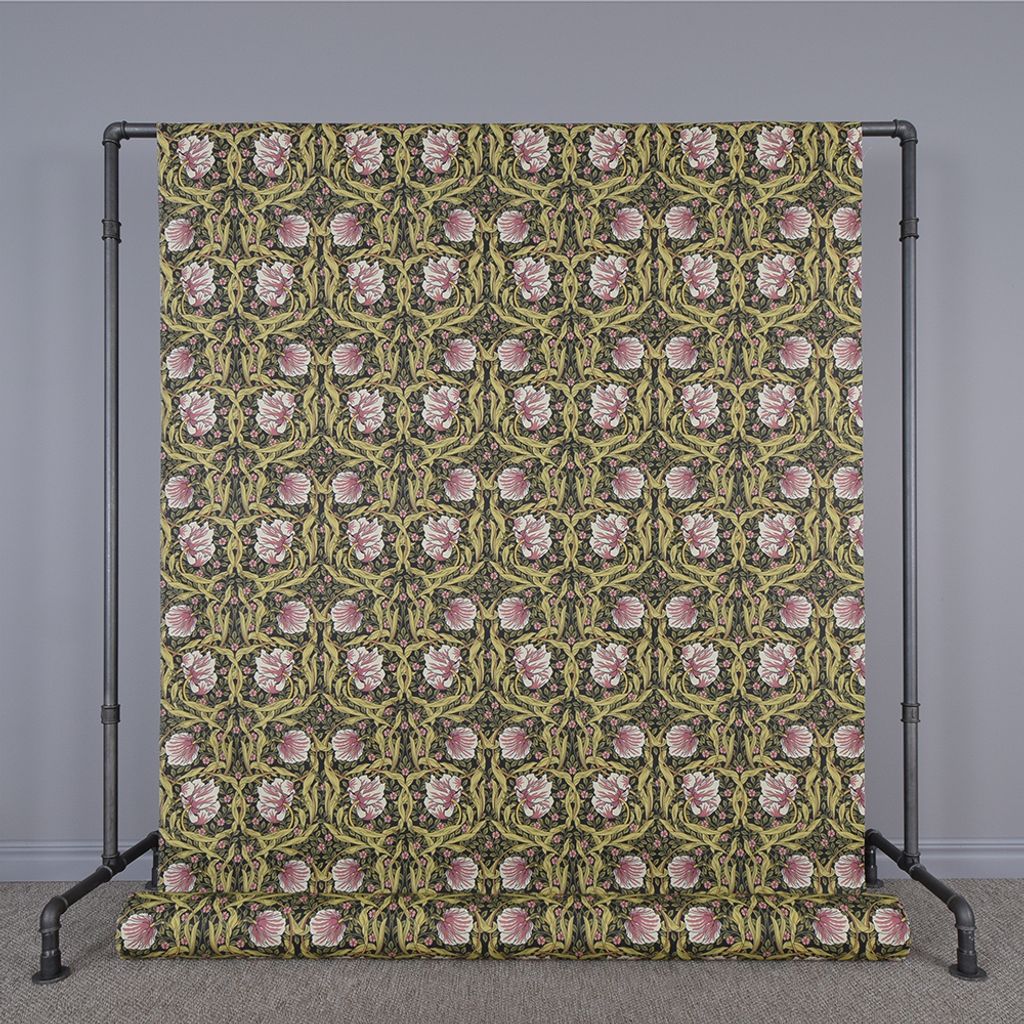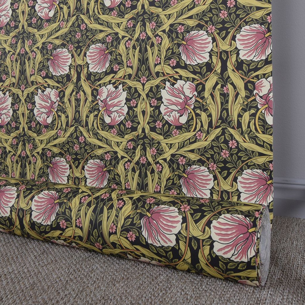 Morris inspirerat tyg med stora och små rosa blommor och snirkligt grönt mönster på mörkgrön botten. Perfekt till gardiner, kuddar, dukar m.m. Baksidan är vit.