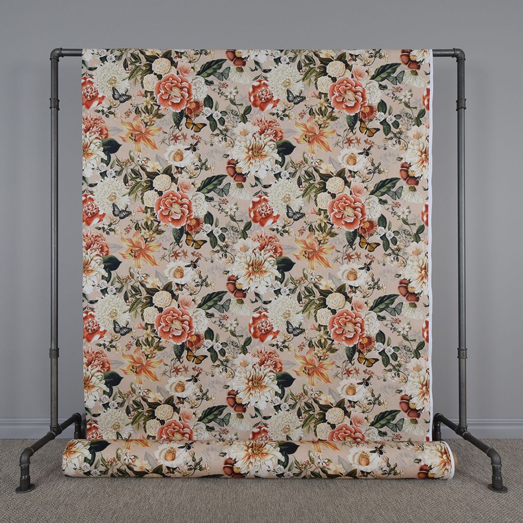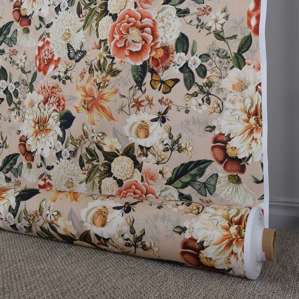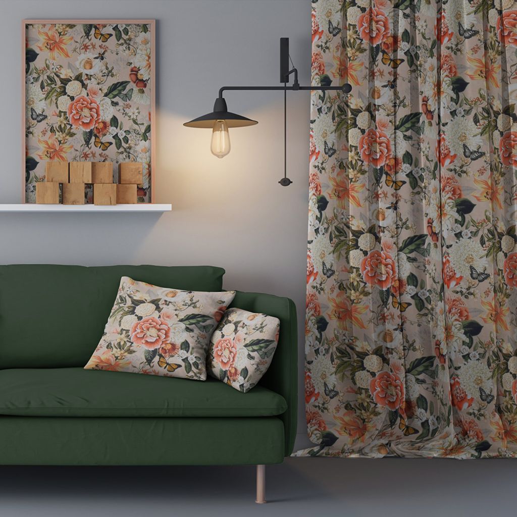 Blommigt gardintyg med romantiska blommor på beige botten.