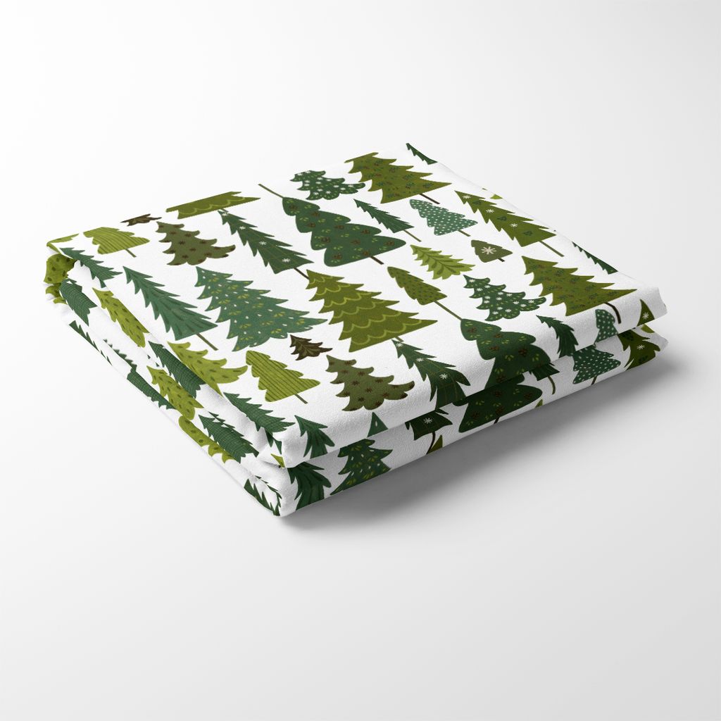 Bordsduk Granby vit-grön mönstret med en mängd olika granar, var och en unikt dekorerad med olika mönster och detaljer, som skapar en dynamisk och livlig granskog.