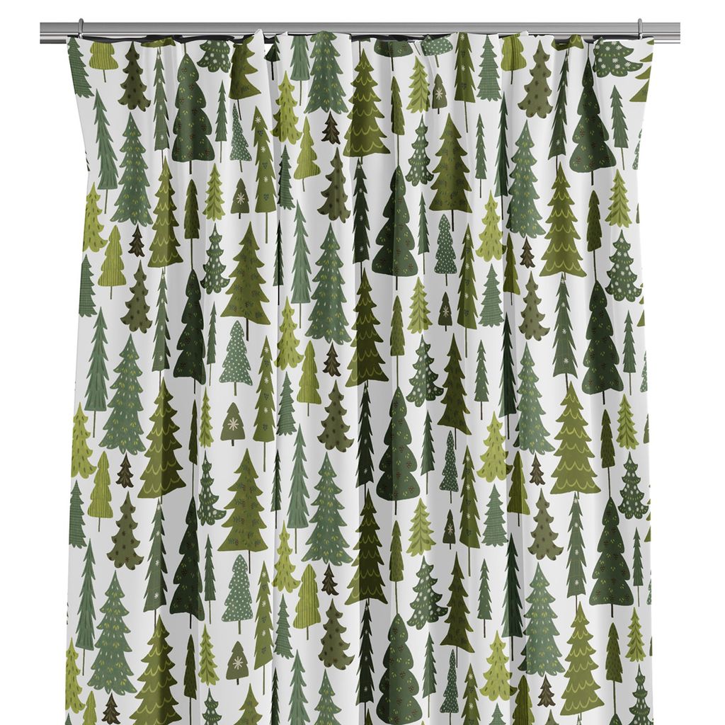Gardinerna Granby vit-grön har ett mönster som består av en mängd olika granar, var och en unikt dekorerad med olika mönster och detaljer, som skapar en dynamisk och livlig granskog. Levereras ouppfållad med overlock nedtill.
