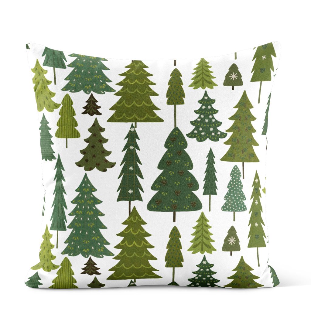 Granby vit-grön kuddfodral med charmigt granmotiv på en ljus bakgrund, perfekt för en skandinavisk inredning.