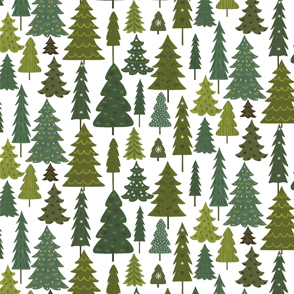 Mönstret består av en mängd olika granar, var och en unikt dekorerad med olika mönster och detaljer, som skapar en dynamisk och livlig granskog.