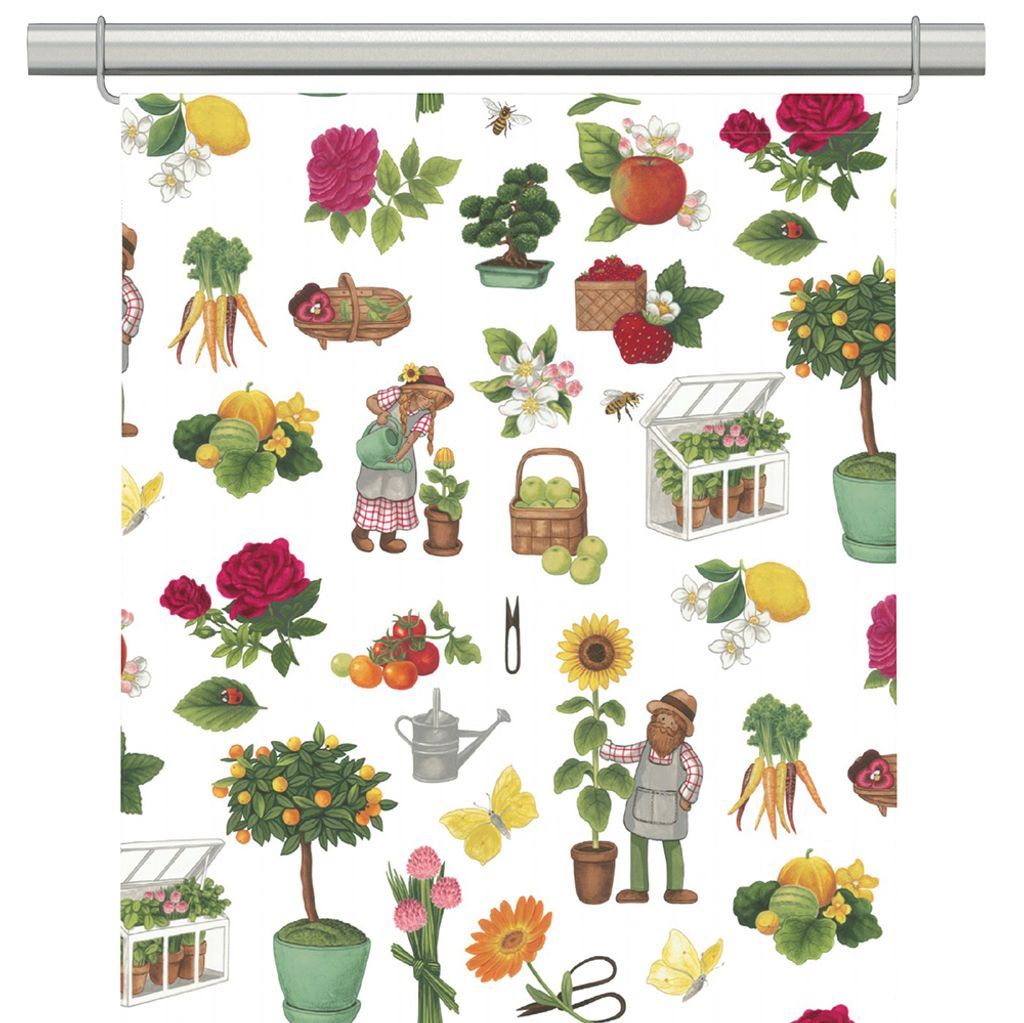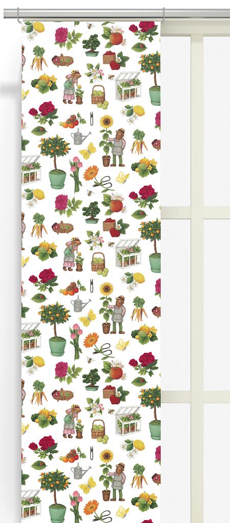 Gräv & Gro panelgardiner är skapade för dig som älskar känslan av trädgård, odlingsglädje och klassiska illustrationer. Mönstret är fyllt av detaljer som blommor, fruktträd, grönsaker, redskap och små trädgårdsfigurer – allt samlat i ett levande blomstermönster som känns både tidlöst och lekfullt.