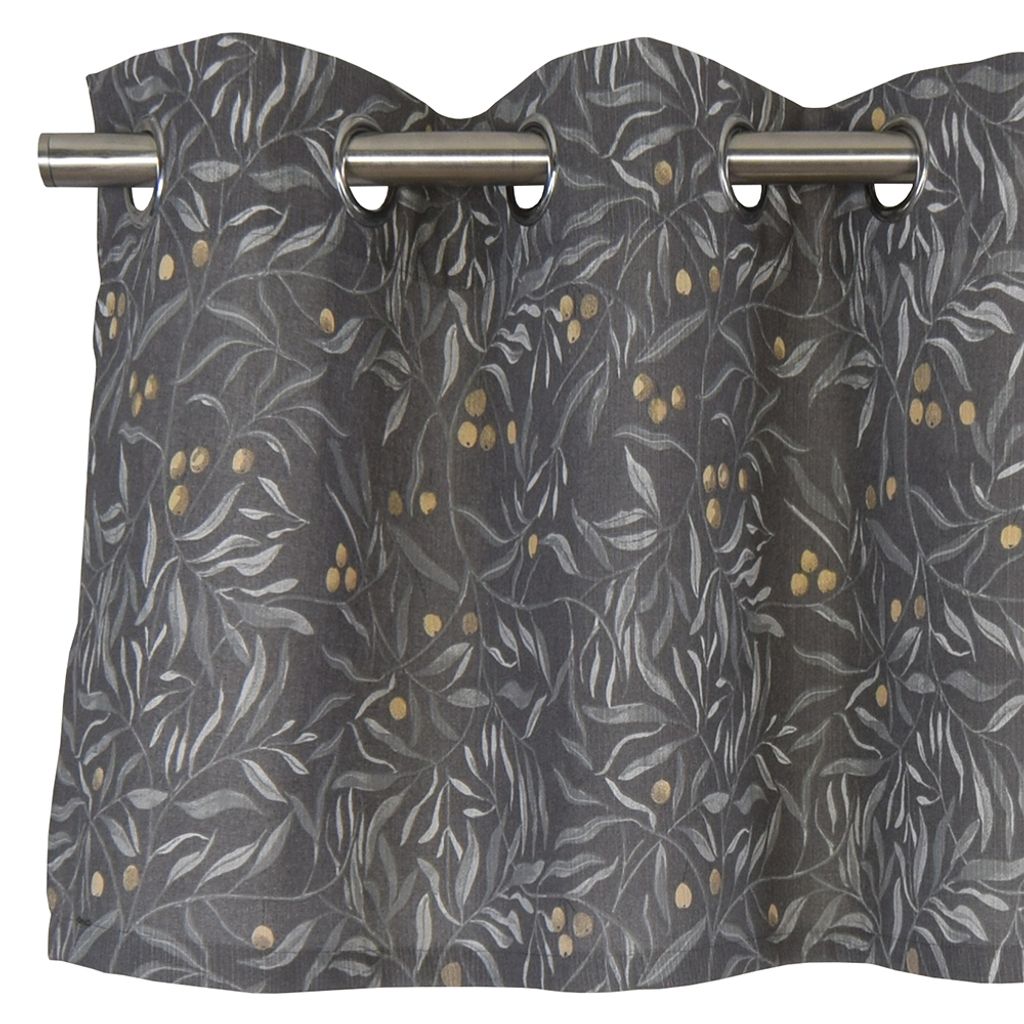Mörkgrå gardinkappa med öljetter, grå blad och gula bär.