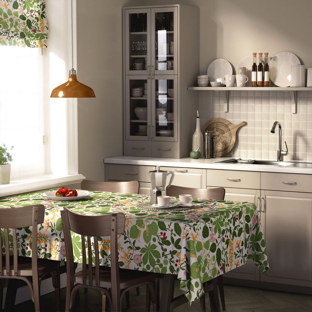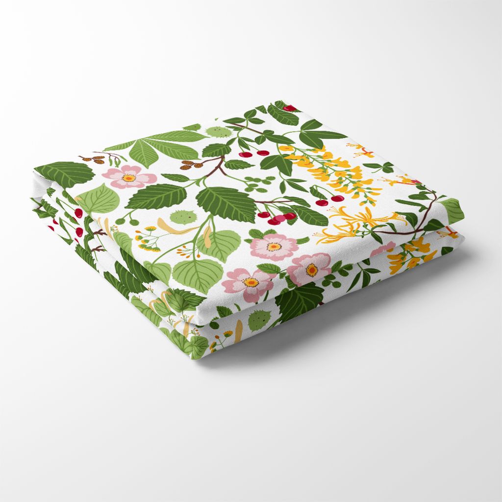 Bordsduk med sommarblommor och blad i ett vackert grönskande mönster på vit botten, designat av Edholm Ullenius.