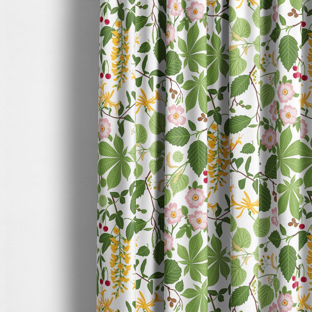 Sommarblommor och blad i ett vackert grönskande mönster på vit botten, design Edholm Ullenius.