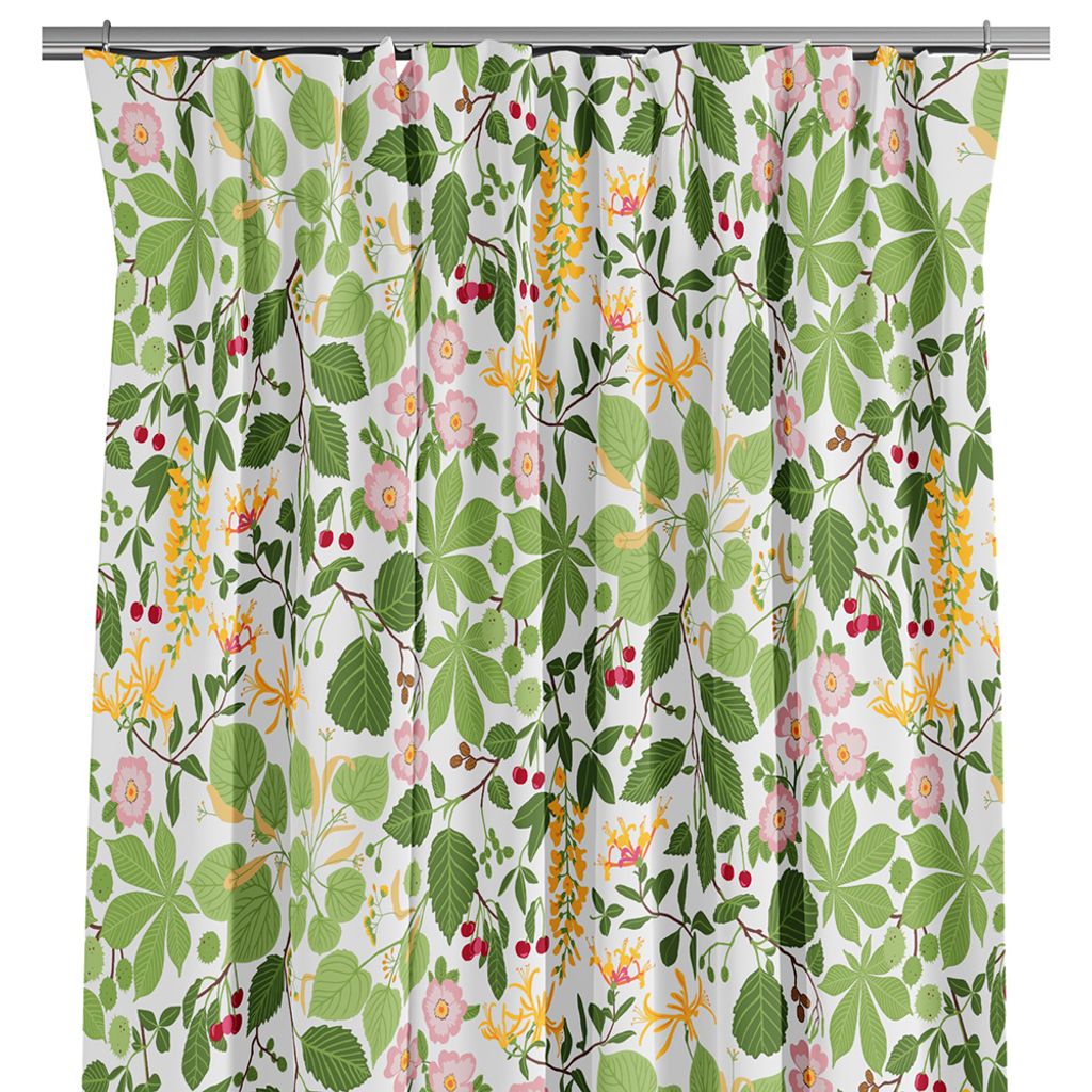 Gardinerna Haga grön med färgglatt mönster av sommarblommor.
