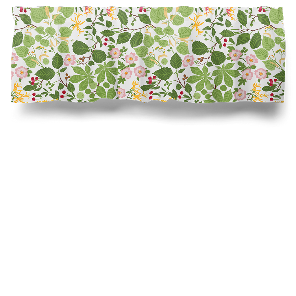 Gardinkappa på metervara med multiband och ofållade sidor. Sommarblommor och blad i ett vackert grönskande mönster på vit botten design Edholm Ullenius. Kappan är 55cm hög.