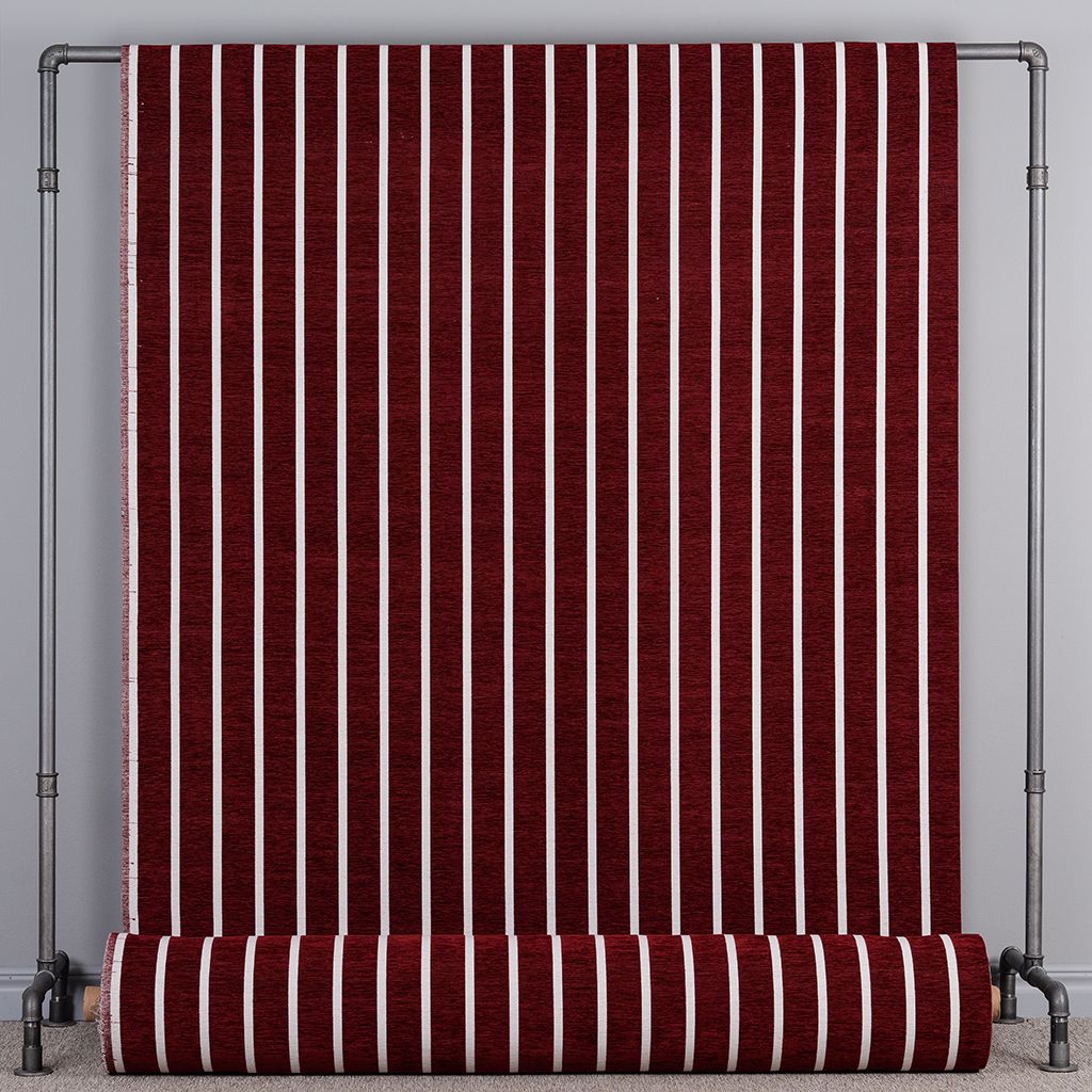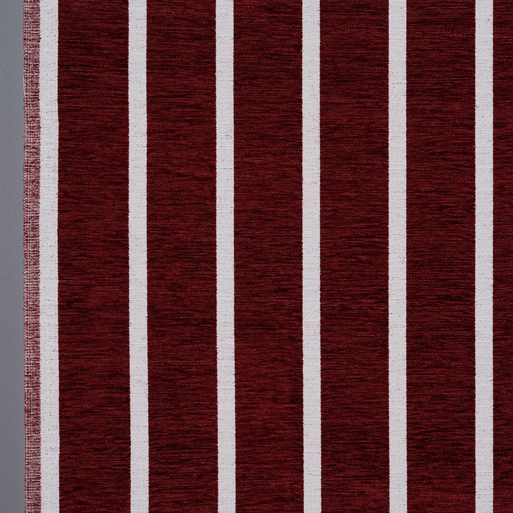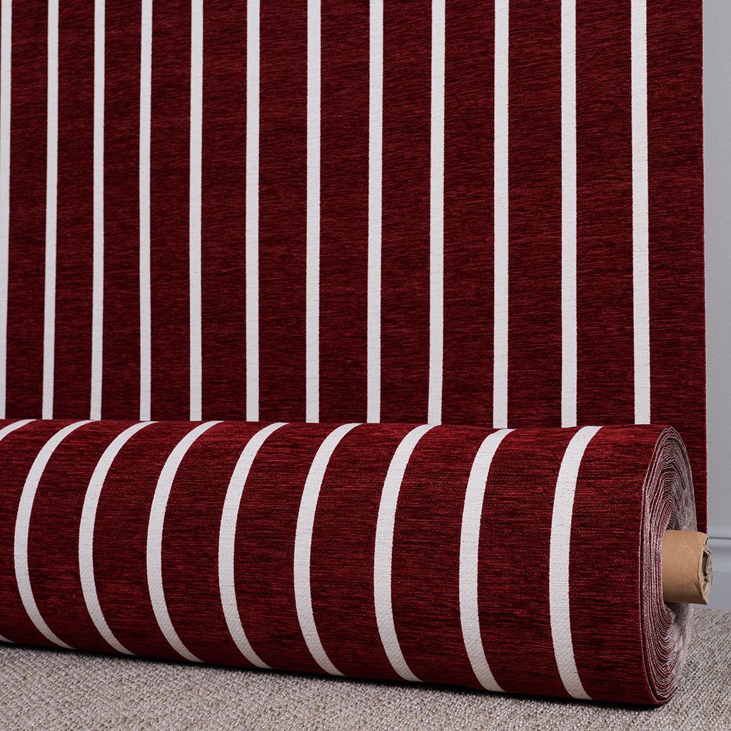 Halle vinröd är ett stilfullt möbeltyg med ett tydligt randigt mönster där en djup röd nyans kombineras med smala naturvita ränder. Färgen drar åt vinrött och skapar ett varmt, ombonat och exklusivt uttryck som tillför både karaktär och elegans till rummet.