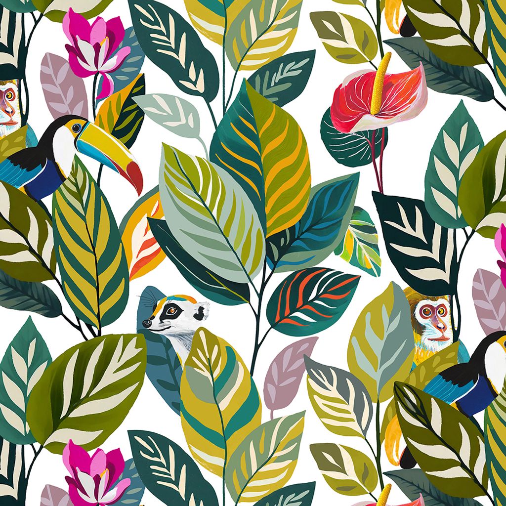 Med ett livfullt och lekfullt mönster av exotiska djur som tukaner, apor och surikater, gömda bland frodiga bladverk och tropiska blommor, skapar detta tyg en härlig känsla av äventyr.