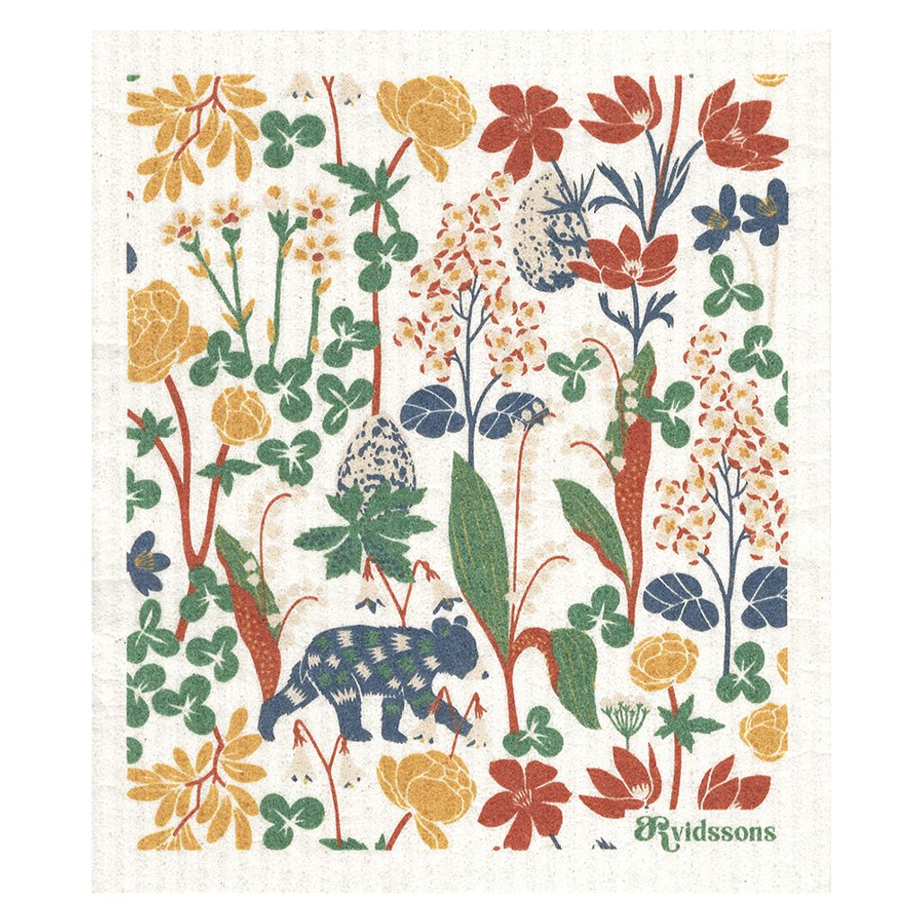 Disktrasa med blomstertryck på vit bakgrund, inspirerad av nordisk skog, Gjord av 100% biologiskt nedbrytbart material.