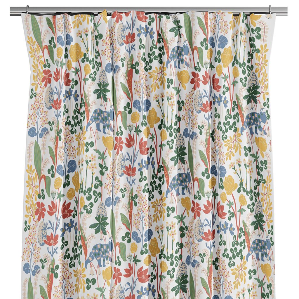 Färgglada gardiner med blommor och söta Björnar. Tyger är designat av Hanne Werning för Arvidssons Textil. Tryckt en fin bomullsvara som hänger fint som gardiner. Ouppfållad med overlock nedtill