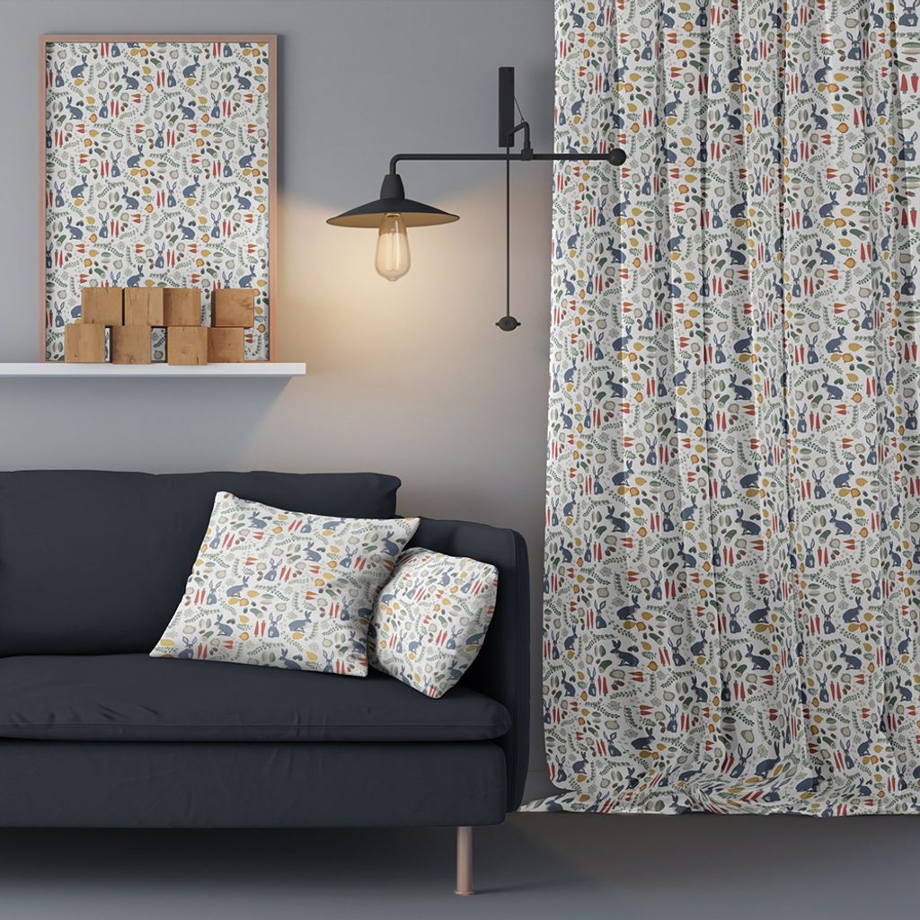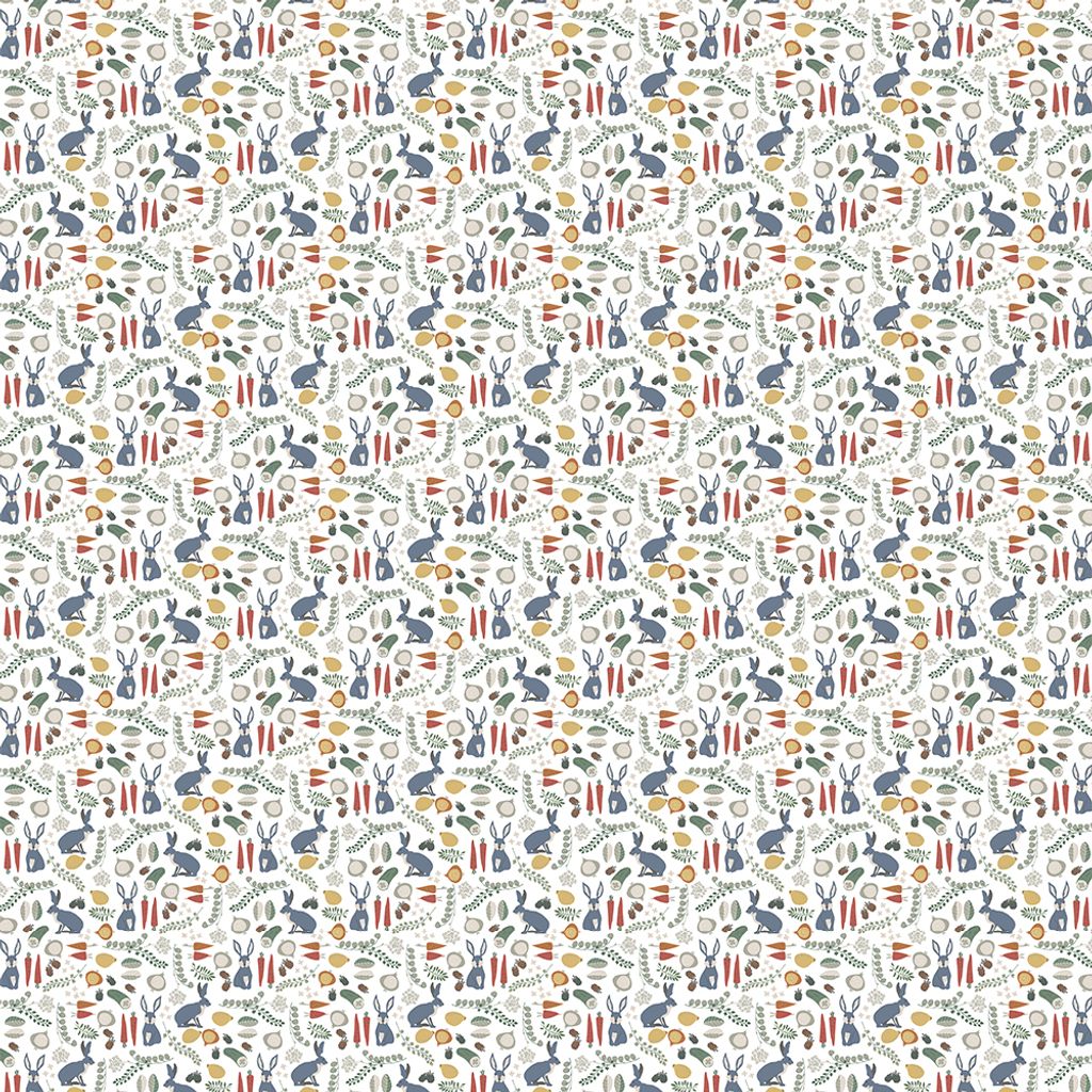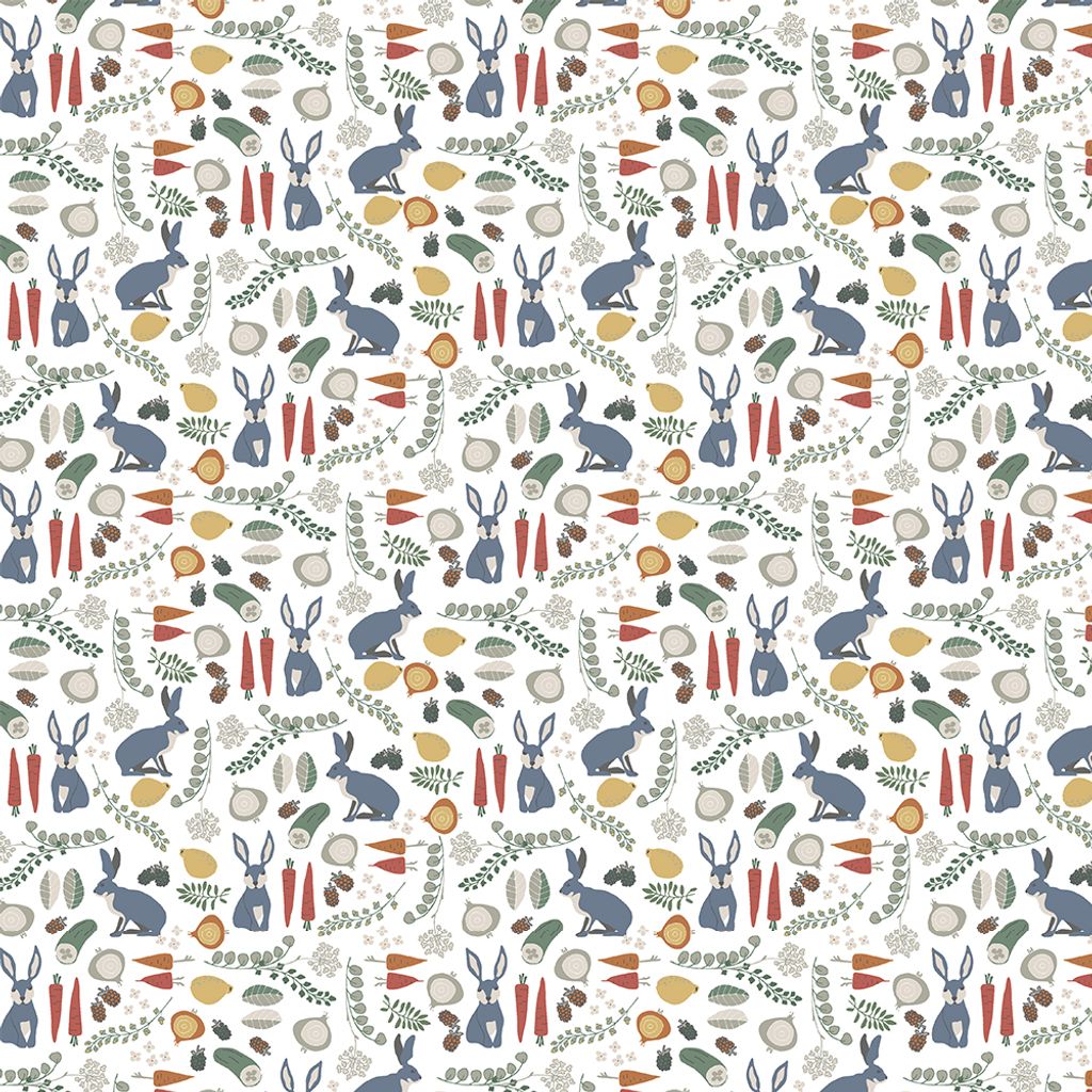Gulligt småmönstrat tyg med harar och grönsaker, design Björk Forth.