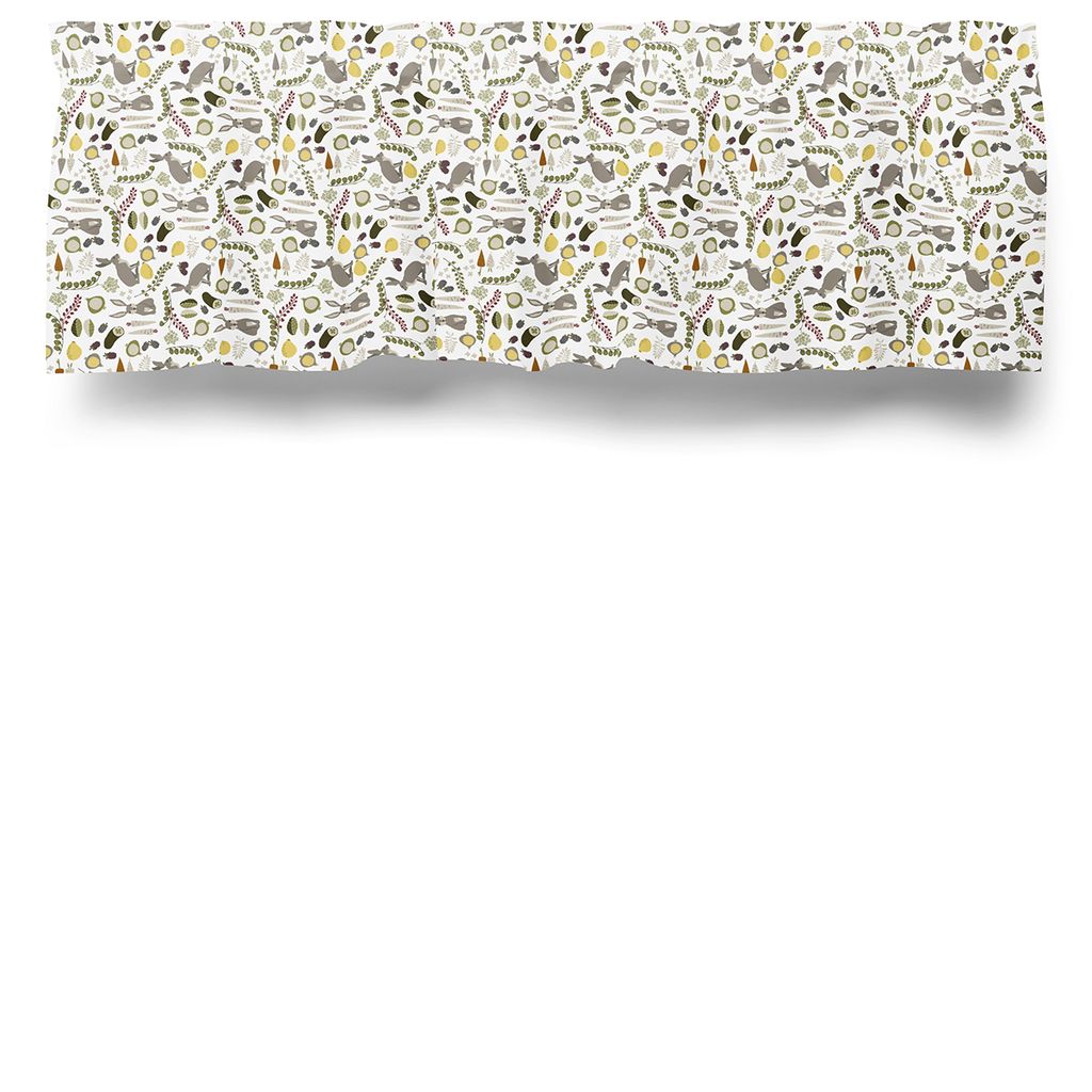 Beskrivning av Harens grönsaksfest grå gardinkappa metervara