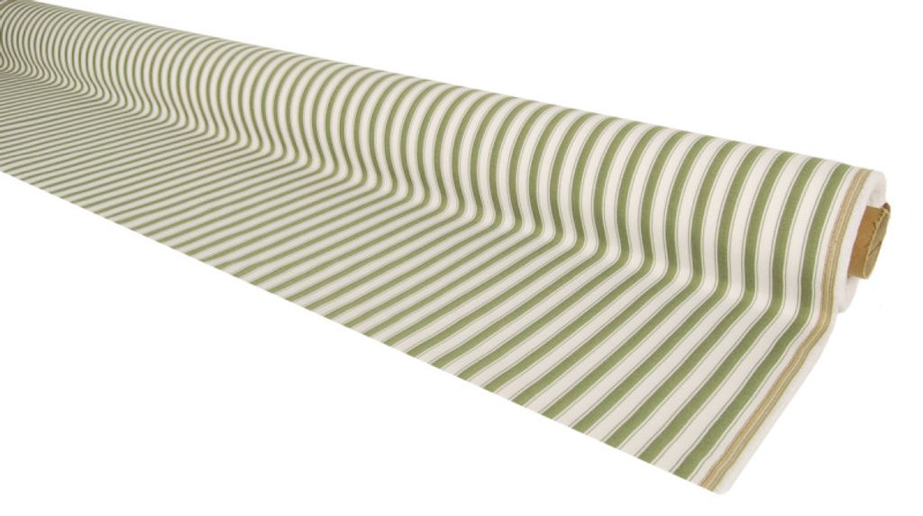 Randigt vävt tyg i allmoge grön och offwhite som är lika på båda sidorna. Tyget har en martindale på 35000 vilket gör att det passar både gardin och enklare möbel tapetsering.
