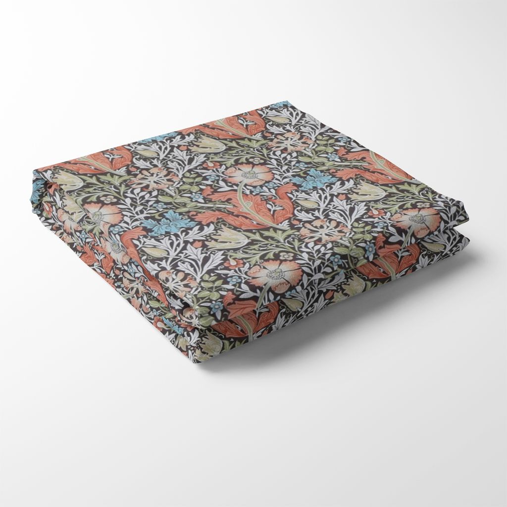Bordsduk med brun botten och blommor, blad och snirkligt mönster i orange, grönt, ljusbrunt och blått.