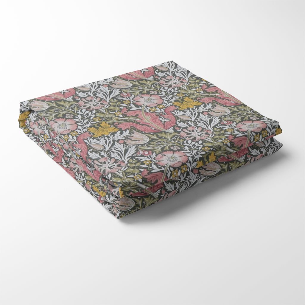 Vacker bordsduk med skogsgrön botten och blommor, blad och snirkligt mönster i grönt, gult och rosa.