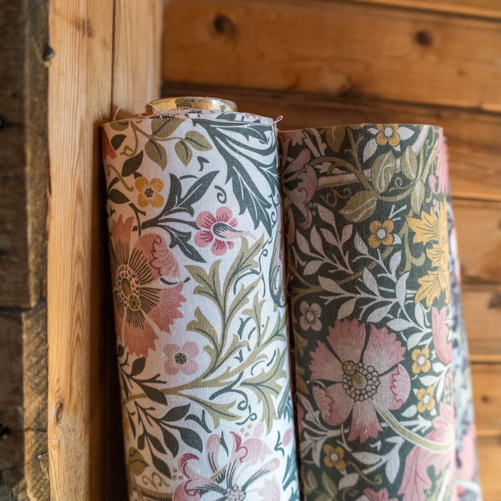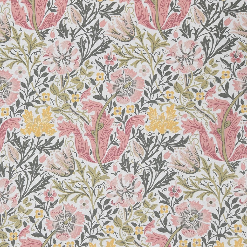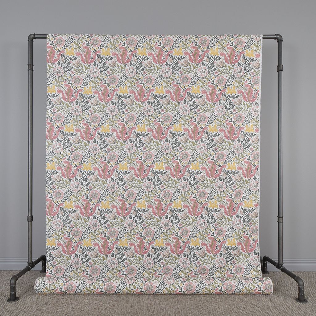 Digitaltryckt tyg i bomull för gardiner, inredning och lättare möbelklädnad. Tyget har vit botten och blommor, blad och snirkligt mönster i rosa, gult och grönt.