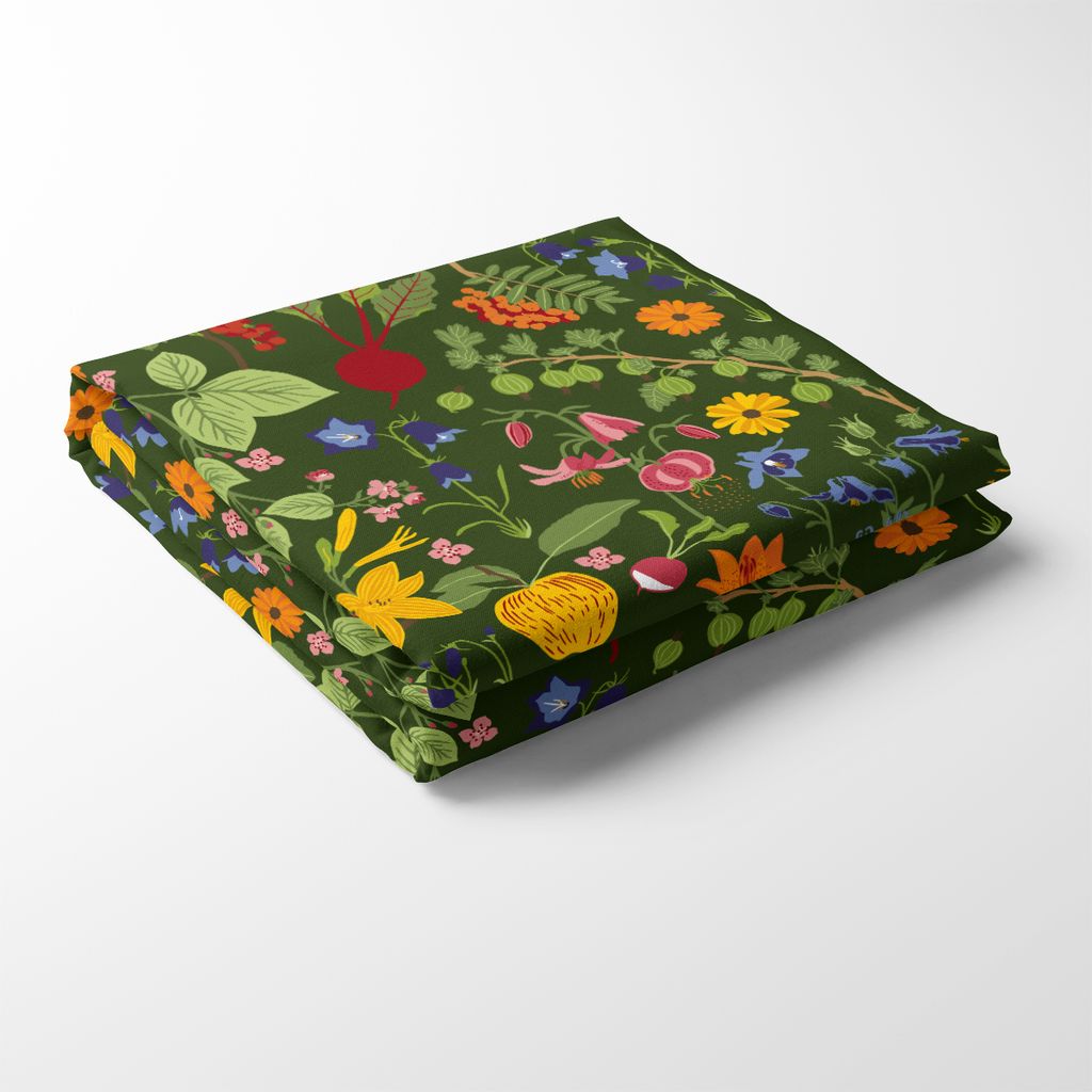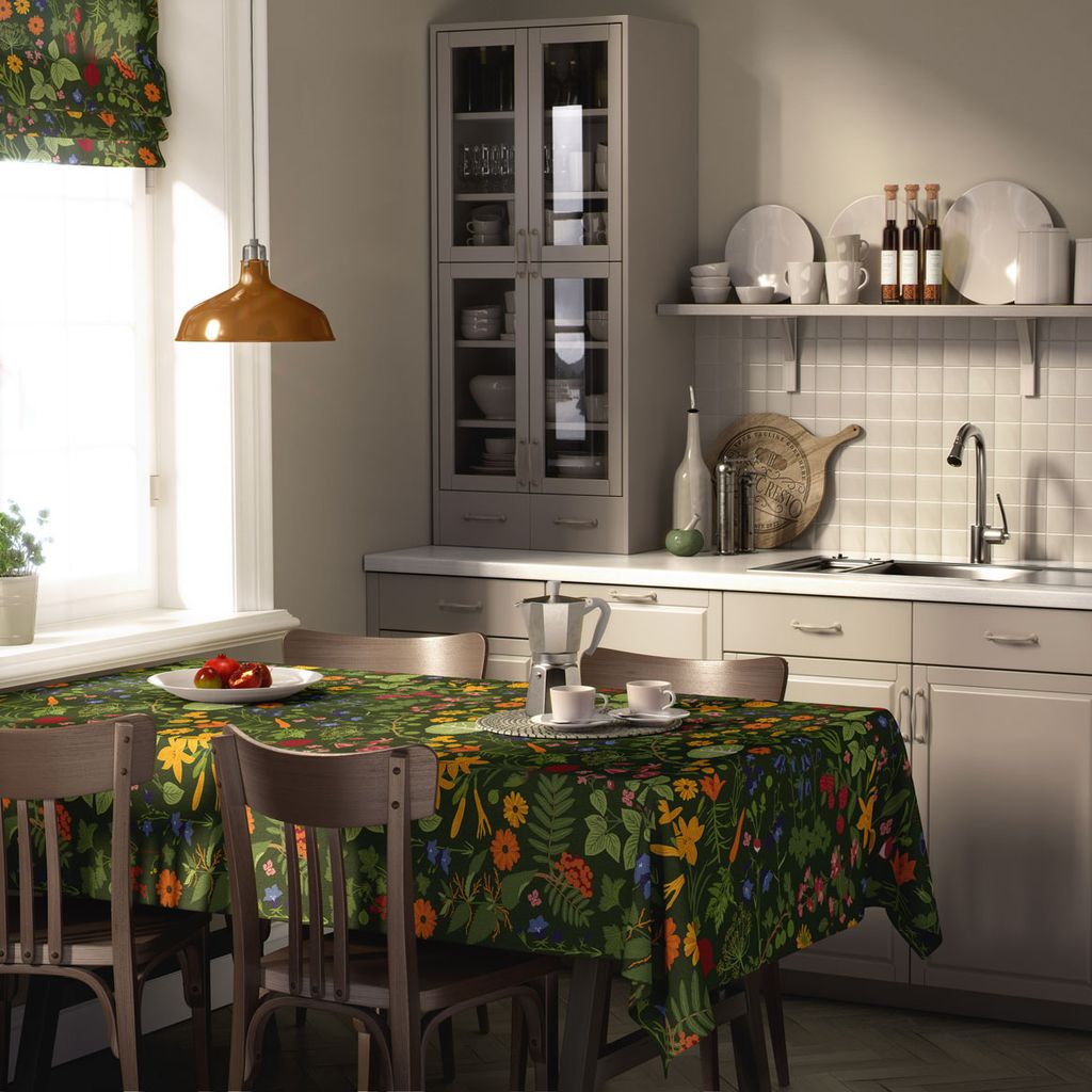 Snygg grön bordsduk med färgglatt mönster av blommor, grönsaker och bär, designat av Edholm Ullenius.