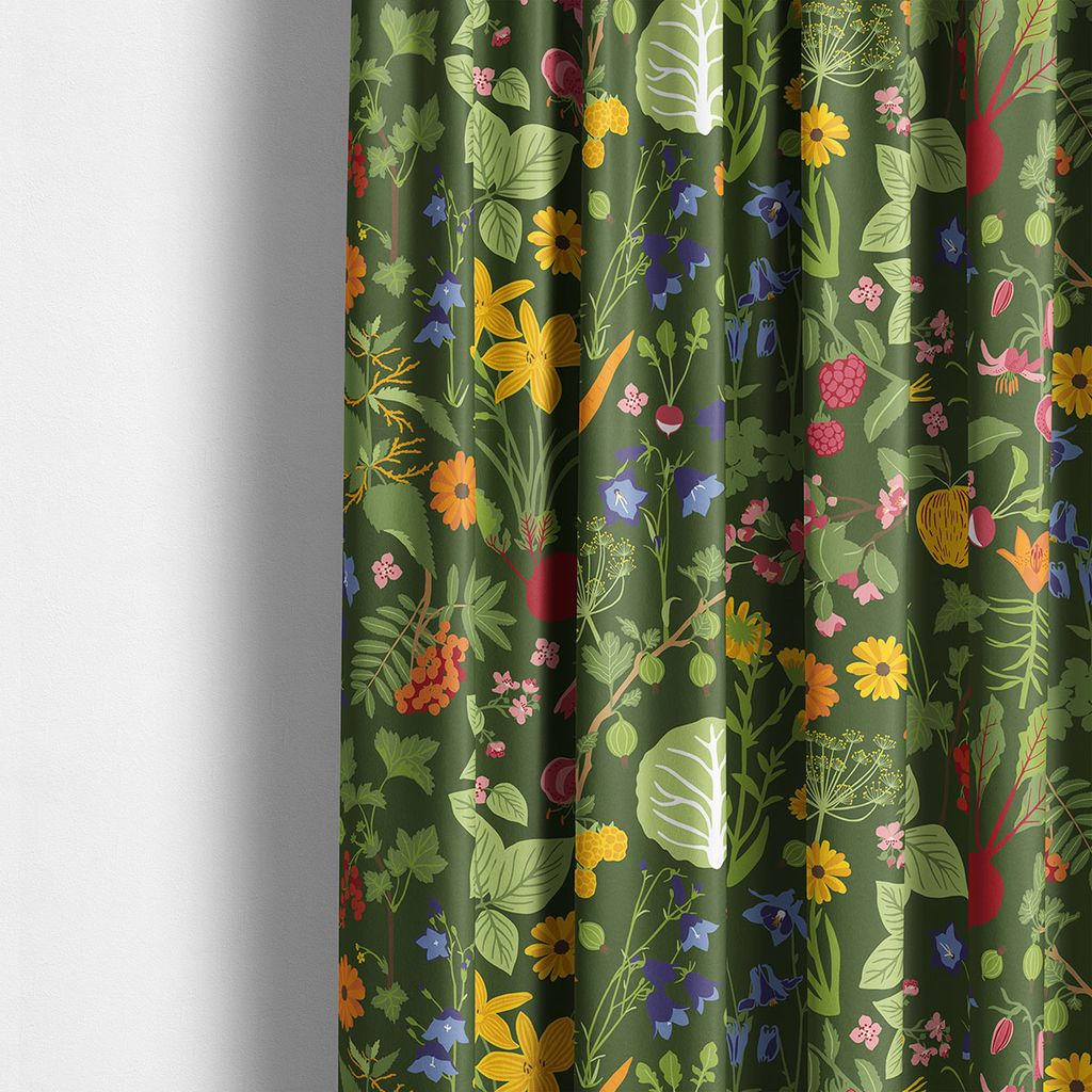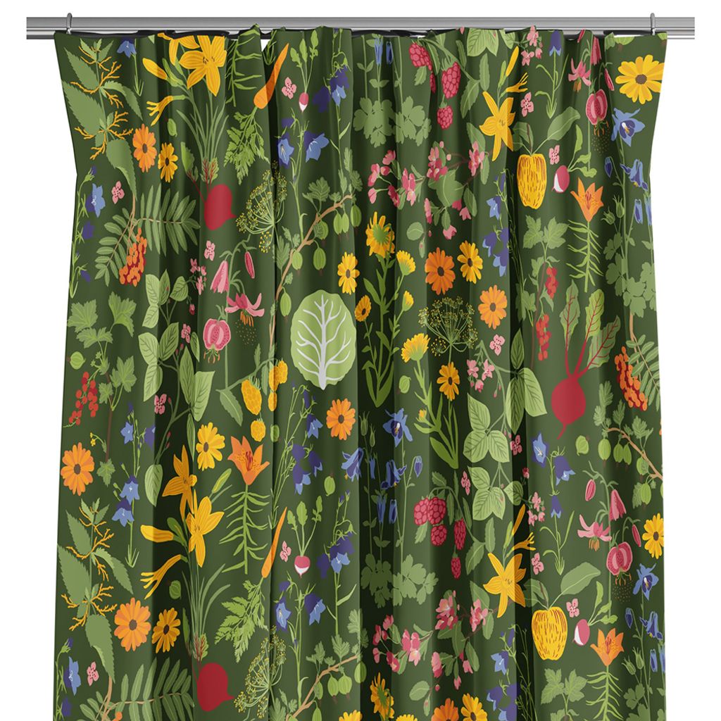 Gardinerna Hedemora vit har färgglatt mönster med blommor, grönsaker och bär, designat av Edholm Ullenius.